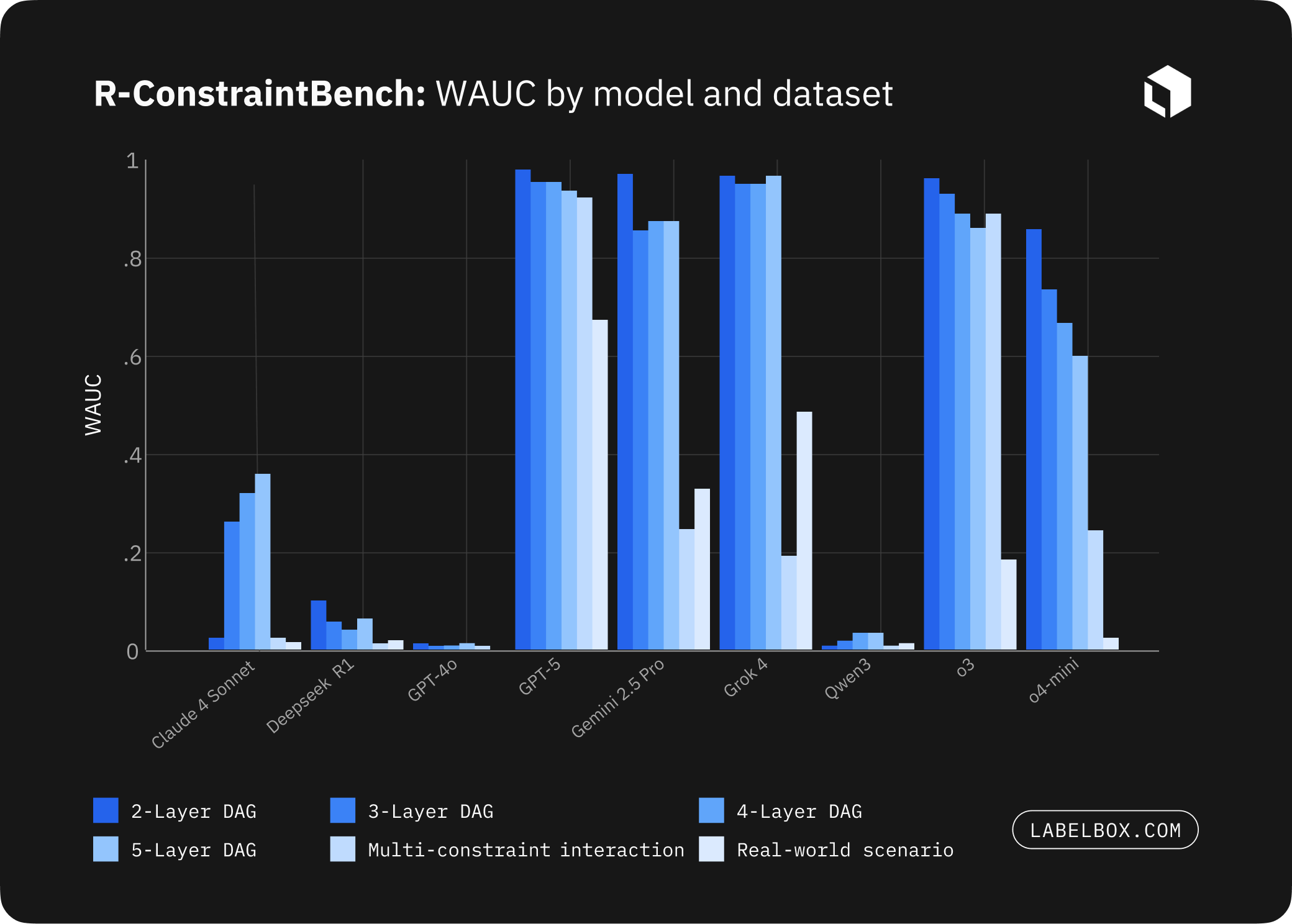 - Synthetic advanced constraints: o3 leads (WAUC 0.931), with GPT-5 close behind (0.924)