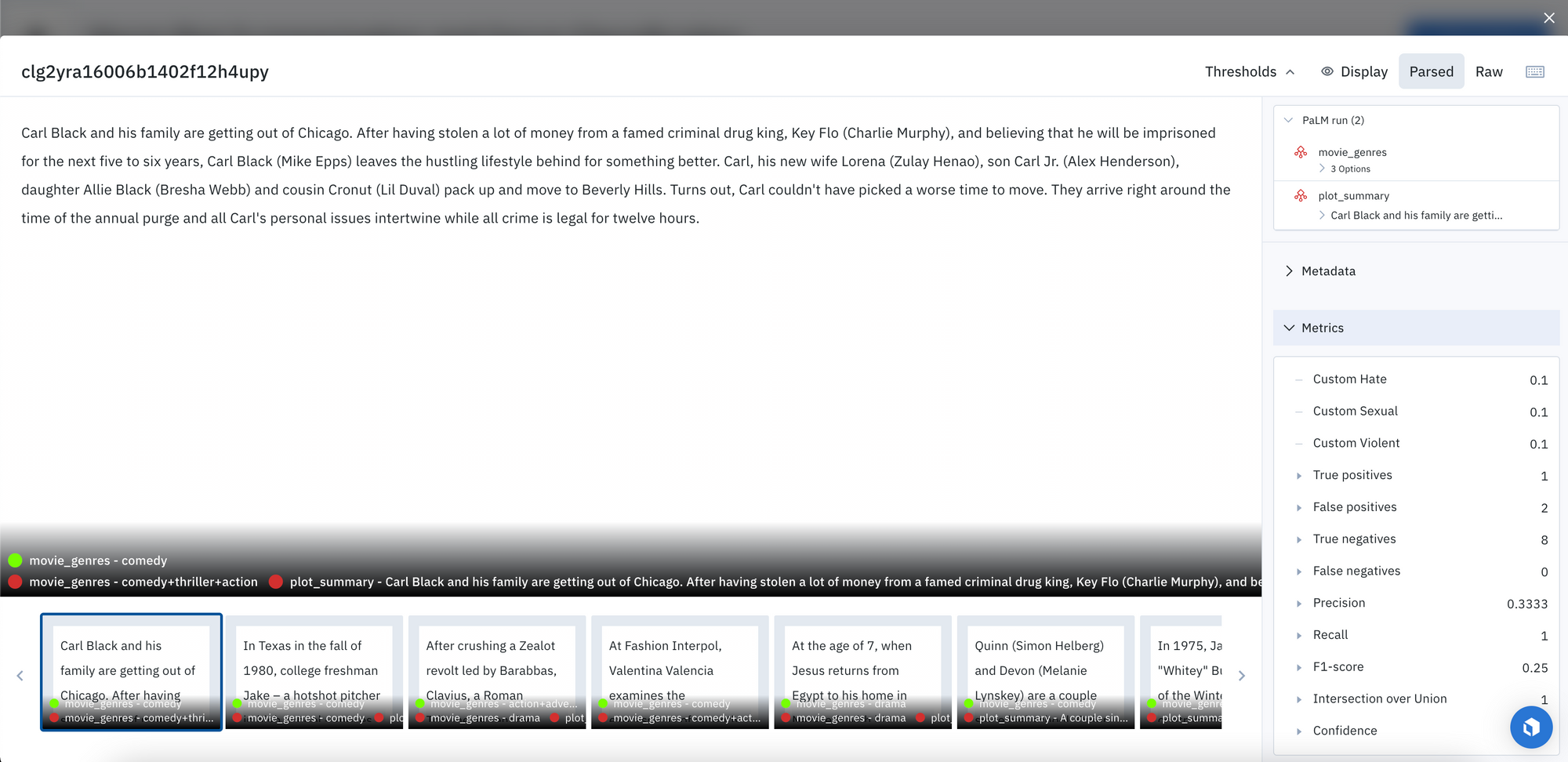 We sampled 100 data points from the Wikipedia Movie Plots dataset from Kaggle. It contains a wealth of information, including long-form movie plots, genres, and other relevant information. For this use case, we are interested in assessing an LLM’s ability to predict the movie genres from the movie plots, as well as their ability to generate an appropriate and succinct summary.