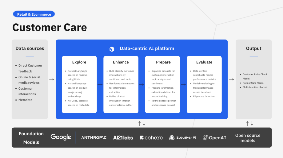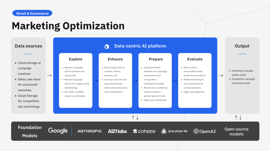 AI teams have many options when it comes to choosing the tools for storing, managing, and labeling their data, training their models, and exploring various foundation models to leverage for their use cases. Choosing tools that integrate well and can function seamlessly as part of a bigger solution is key to avoiding the delays that come with clunky data transfers and code-heavy architectures.