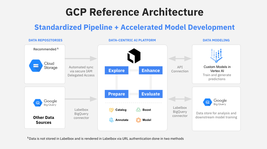 The reference architecture below shows a combination of Labelbox and Google Cloud solutions integrated to form a well-oiled AI development machine. In it, unstructured data is stored in Google Cloud Storage and Google Big Query, each of which can be integrated with purpose-built connectors to Labelbox, a data-centric AI platform. In Labelbox, teams can explore and curate data, label data, incorporate state-of-the-art automation techniques to save labeling time and costs, and more. Labeled data can be seamlessly brought into Vertex AI for model training, and the resulting model predictions can be delivered back into Labelbox for evaluation via a dedicated API. Both labeled data and model predictions can also be transferred back into Google Big Query for analysis and downstream model training as needed.