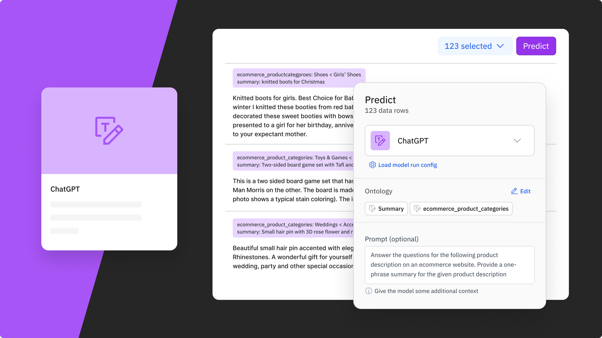 We’ve walked through the process of using a language model (ChatGPT) to generate predictions on product categorization and summary, and evaluate them in depth. The entire process, from problem definition to generating pre-labels, and running evaluation took less than 10 minutes. In our analysis, we see that the model gave largely satisfactory results in a zero-shot setting. This shows the potential of applying large language models to automate the bulk part product categorization tasks.
