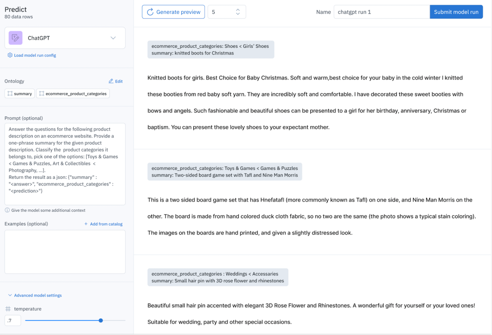 Creating effective prompts for large language models that work well for your use cases is an art. Model Foundry makes it easy to generate a prompt template that works out of the box. All you need to do is define the ontology and optionally provide some instructions and examples – similar to how you would set up a labeling project. As you can see in the screenshot above, you first define the ontology for this model job. In this example, we asked the model to do a radio classification of "ecommerce_product_categories", with the sixteen classes as options, and we also asked the model to provide a summary, formulated as a free text question.