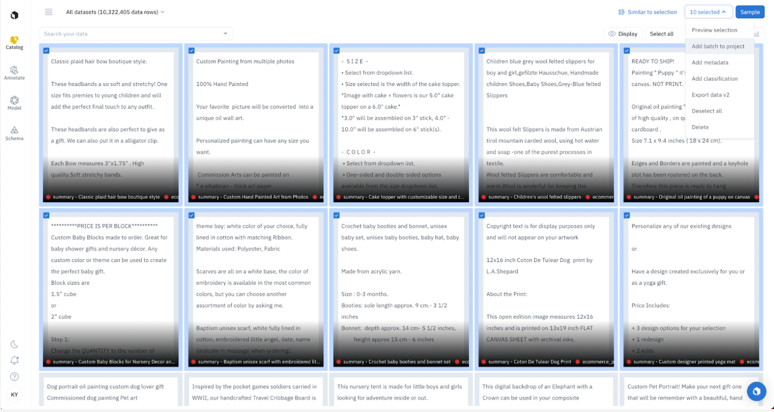 For this example, we took samples of sixteen product categories from the Etsy retail products dataset on Kaggle. It contains a wealth of information, including long-form product descriptions, categories, reviews, sellers, and other relevant information. For this use case, we are only interested in assessing an LLM’s ability to predict the product categories from the long description, as well as their ability to generate a summary (or name) to highlight the product’s features.