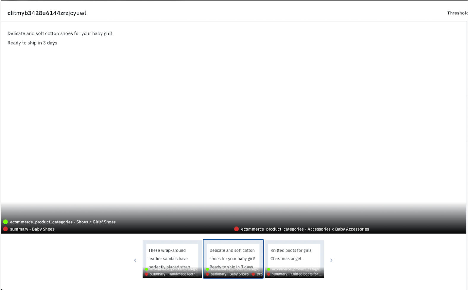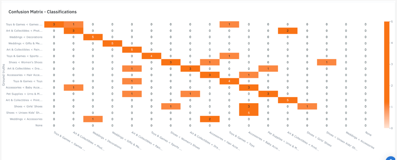 Let’s take a look at the metrics tab first. Here, we can quickly see where the model got things wrong. For example, the model seems to have most of its mistakes in the Shoes category. It has mistaken products from Shoes < Unisex Kids’ Shoes as an Accessories < Baby Accessories product five times, and Girls’ Shoes to Baby accessories three times. It has twice mistaken a product in Wedding < Accessories to be in Hair Accessories.