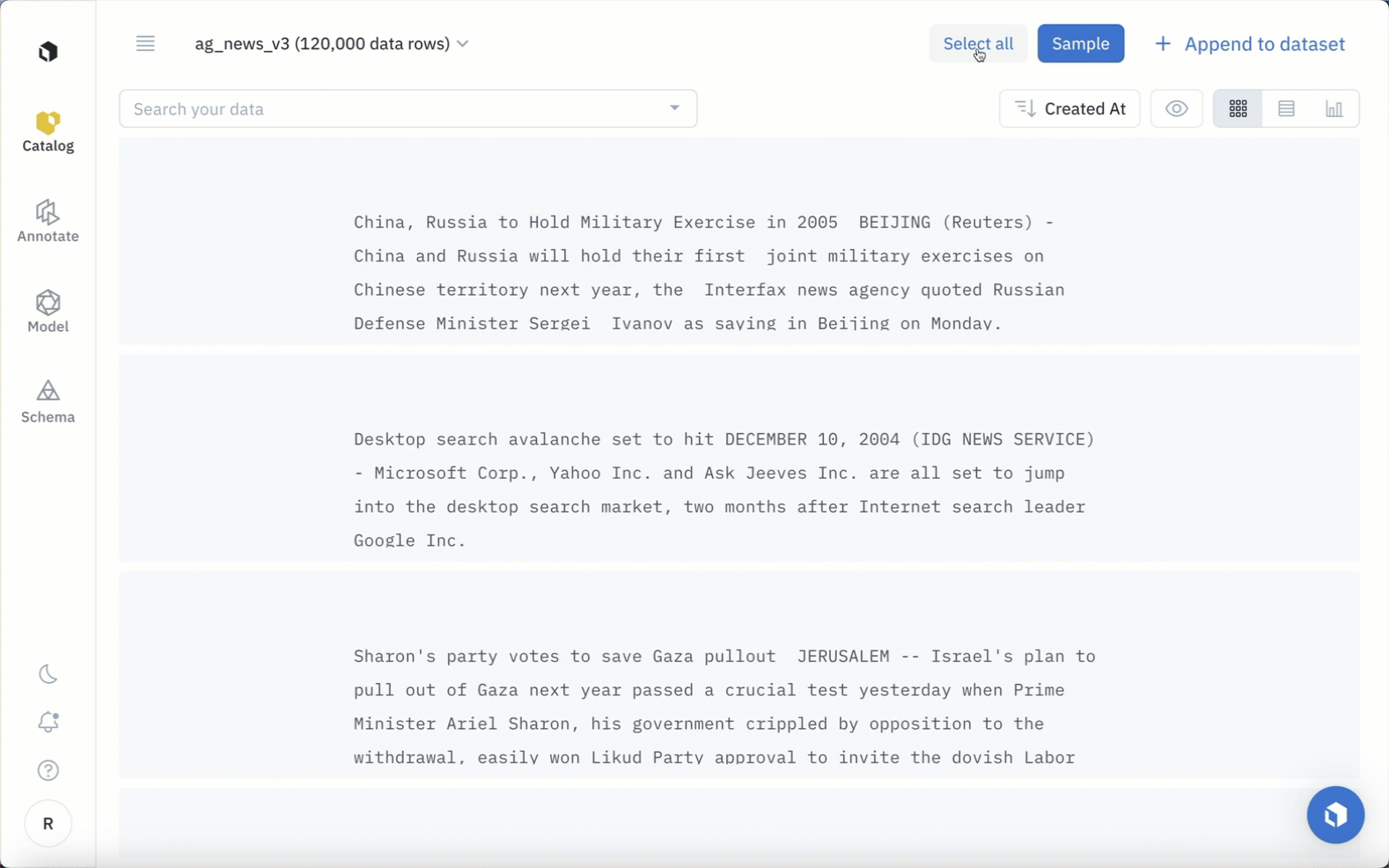 To narrow in on a subset of data by leveraging Catalog’s filters, including media attribute, a natural language search, and more, to refine the text on which predictions should be made. Once you’ve surfaced data of interest, click “Predict with Foundry.”You will then be prompted to choose a model that you wish to use in the model run.