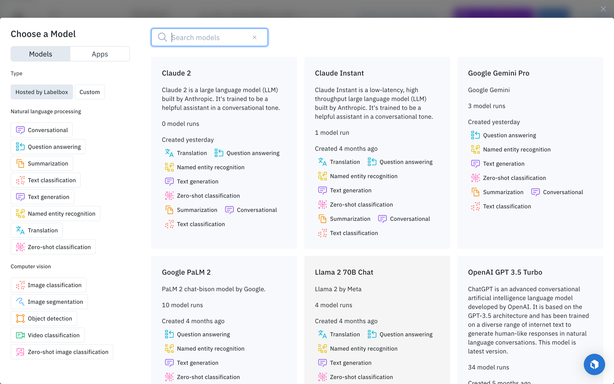 Select a model from the model gallery based on the type of task, such as text classification, summarization, and text generation.