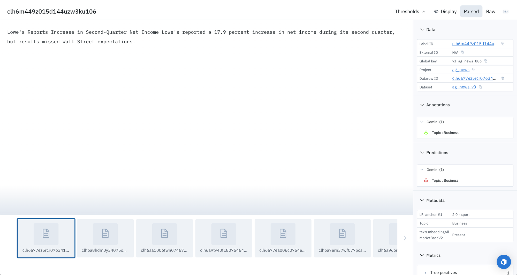 Model metrics are auto-populated and interactive. You can click on any chart or metric to open up the gallery view of the model run and see corresponding examples.