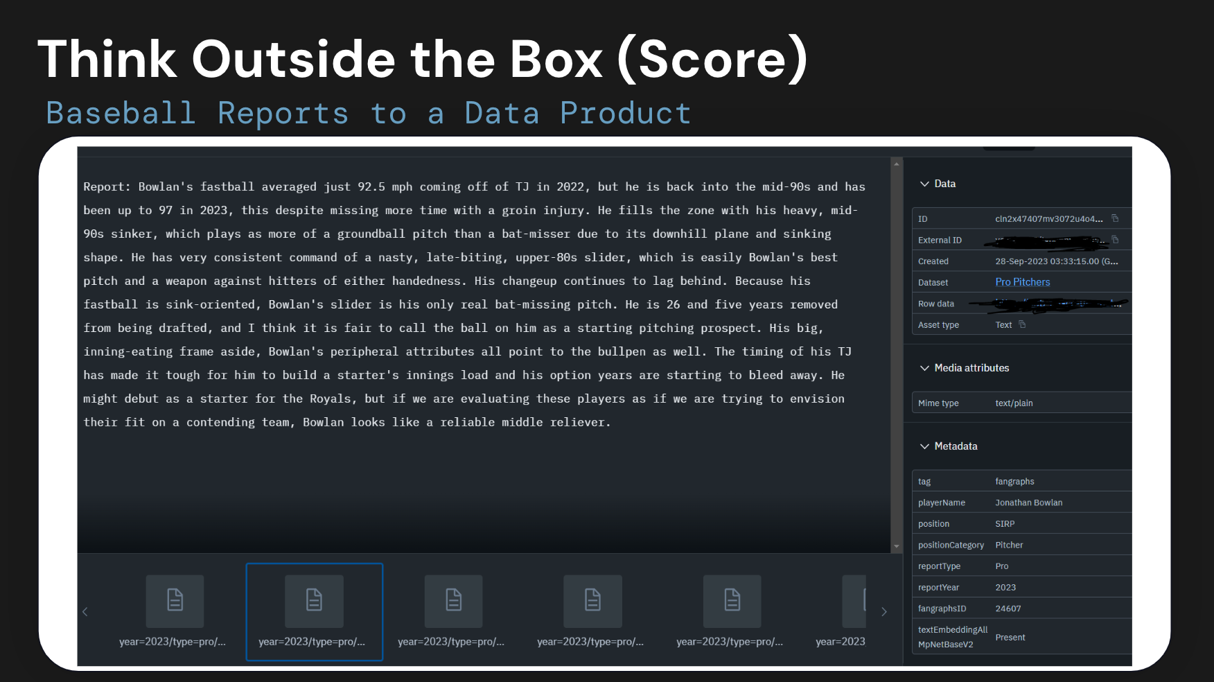 The R&D team at the Texas Rangers Baseball Club drew text data from thousands of scouting reports, articles from various publications and sports journalists, fan-made blogs and media, and more. They then set out to build an LLM-powered solution with the goal of extracting sentiment toward specific players, drawing out statements about their specific strengths and weaknesses, and making the vast amount of data more digestible for their front office decisionmakers at the club.
