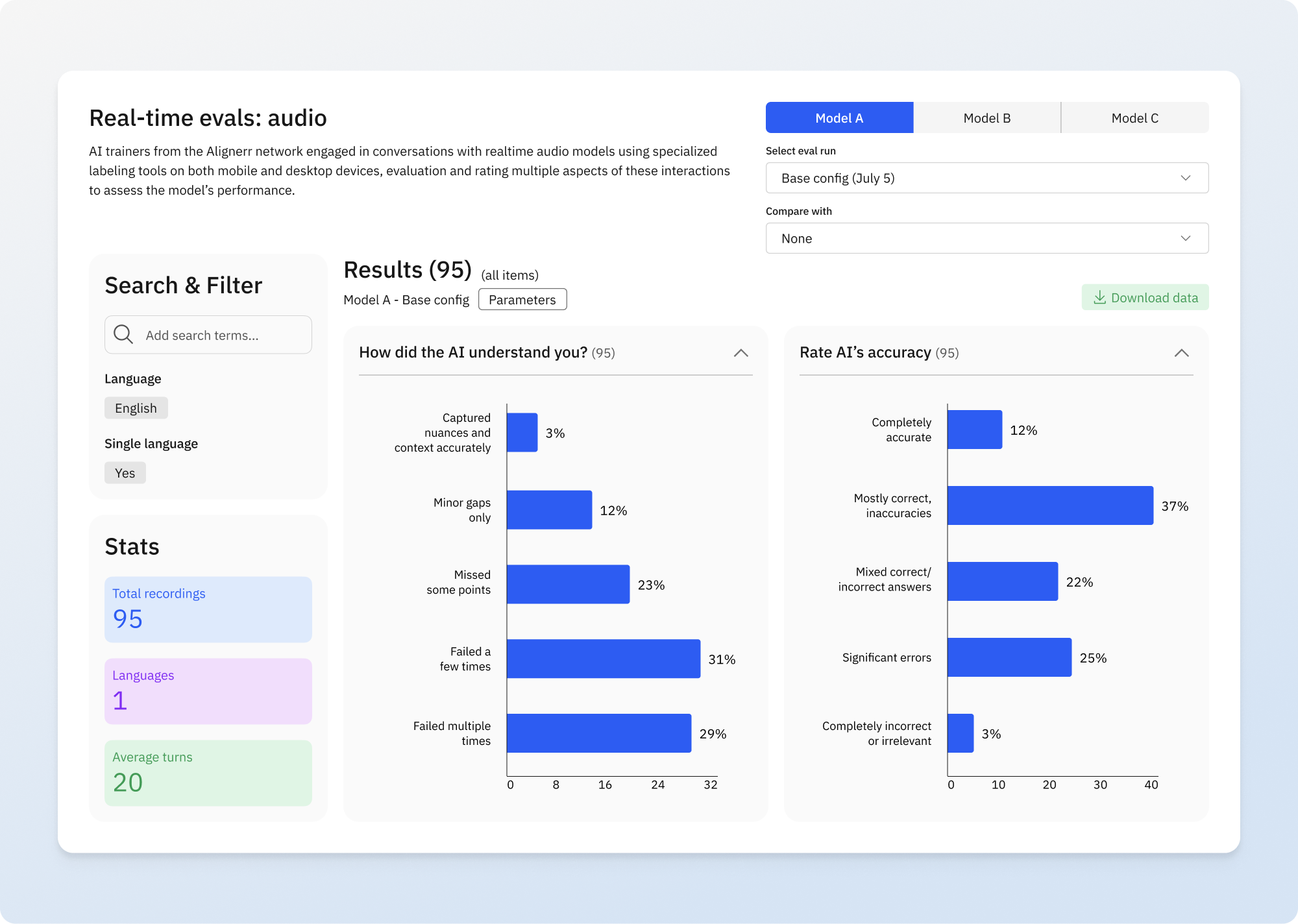 - We provide the software and methodology: Labelbox works closely with you to design evaluation protocols tailored to your goals, drawing on our expertise and the Alignerr network to implement high-quality, custom metrics and analysis workflows.