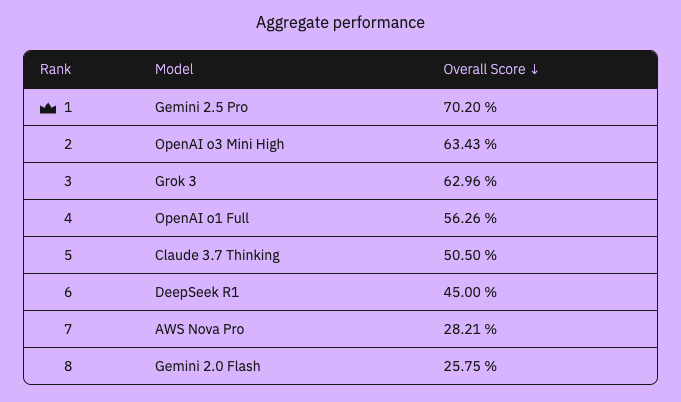 Here, we focus on the final answer and how often each model reaches the correct solution. Again, Gemini 2.5 Pro appears at the top, followed by OpenAi’s o3, Grok 3, Deepseek’s R1, and Claude 3.7 Thinking.