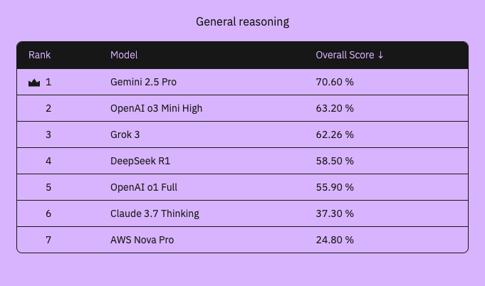 We have a clear top performer in reasoning as of now, and its Gemini 2.5 Pro model—although Grok 3 edged out Gemini in our Applied math evaluations. The remaining contenders all performed at a lower level across all of our sections, and in general performance as well. In general, models are not yet performing at a consistently high level across complex reasoning tasks—at least those focused on the math, coding and general reasoning topics we tested.