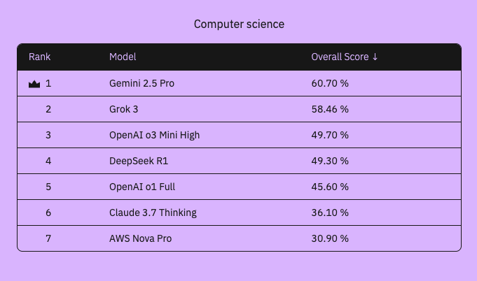 - Pure math, computer science, and general domains: Gemini 2.5 Pro swept the top spot in all three of these categories. OpenAI models, Grok 3 and DeepSeek R1 performed well after that, even though the majority of models showed low performance (<50%) in the computer science evaluations.