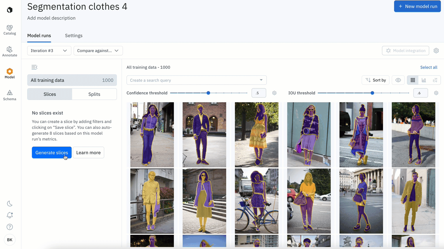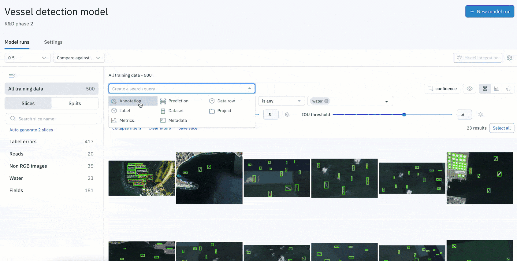 - Generate custom slices based on a specific search query tailored to your use case. For example, you can organize your data by specific search filters or confidence thresholds