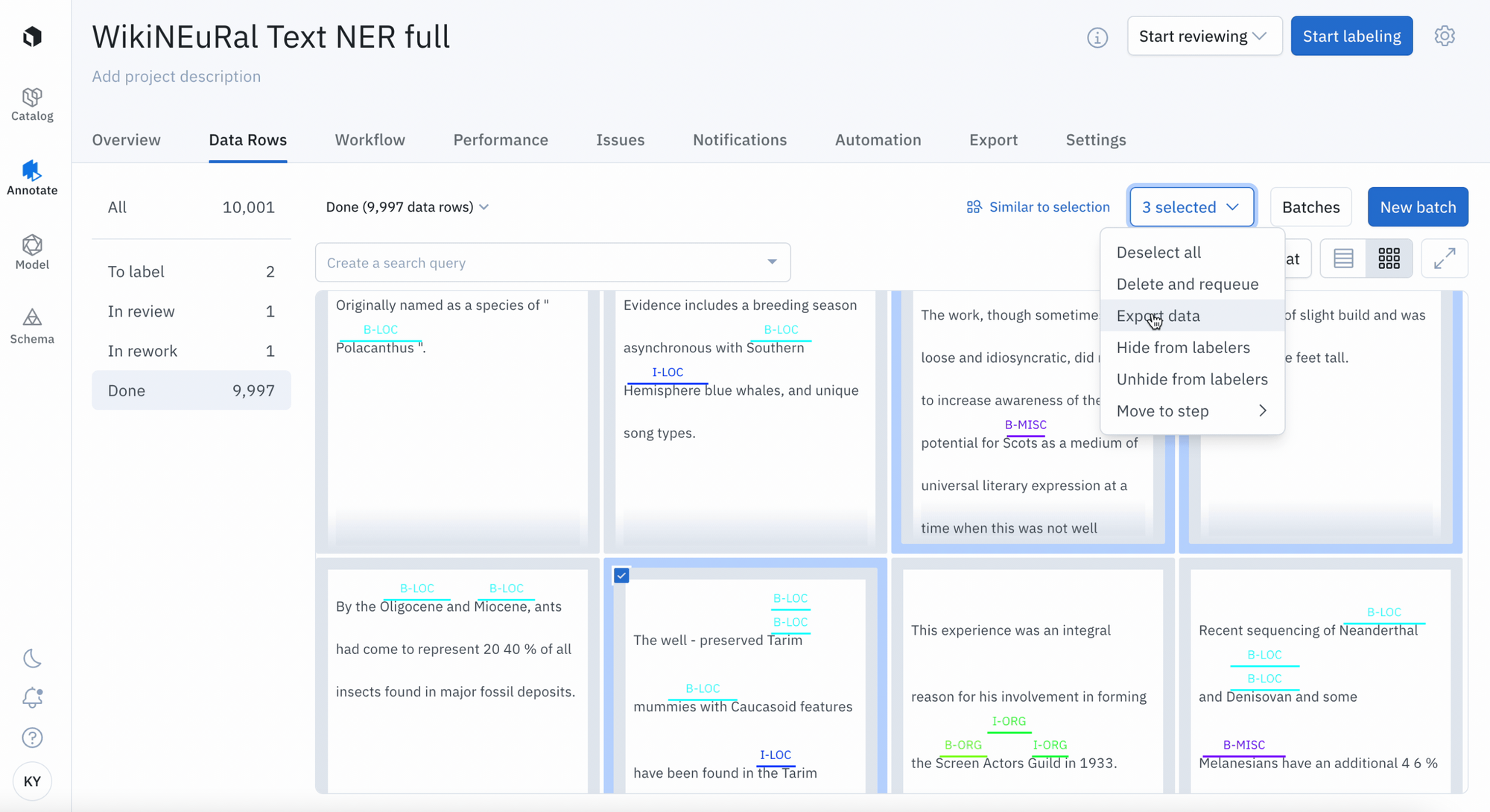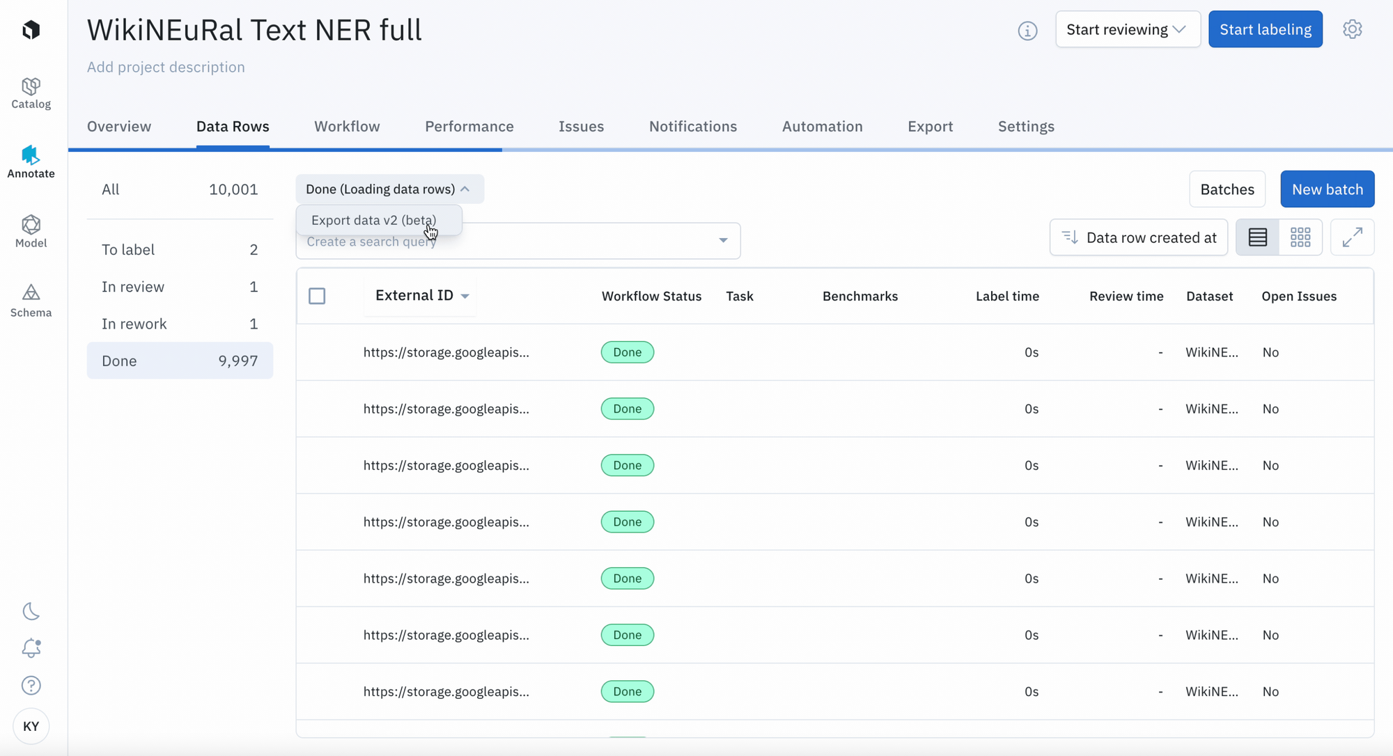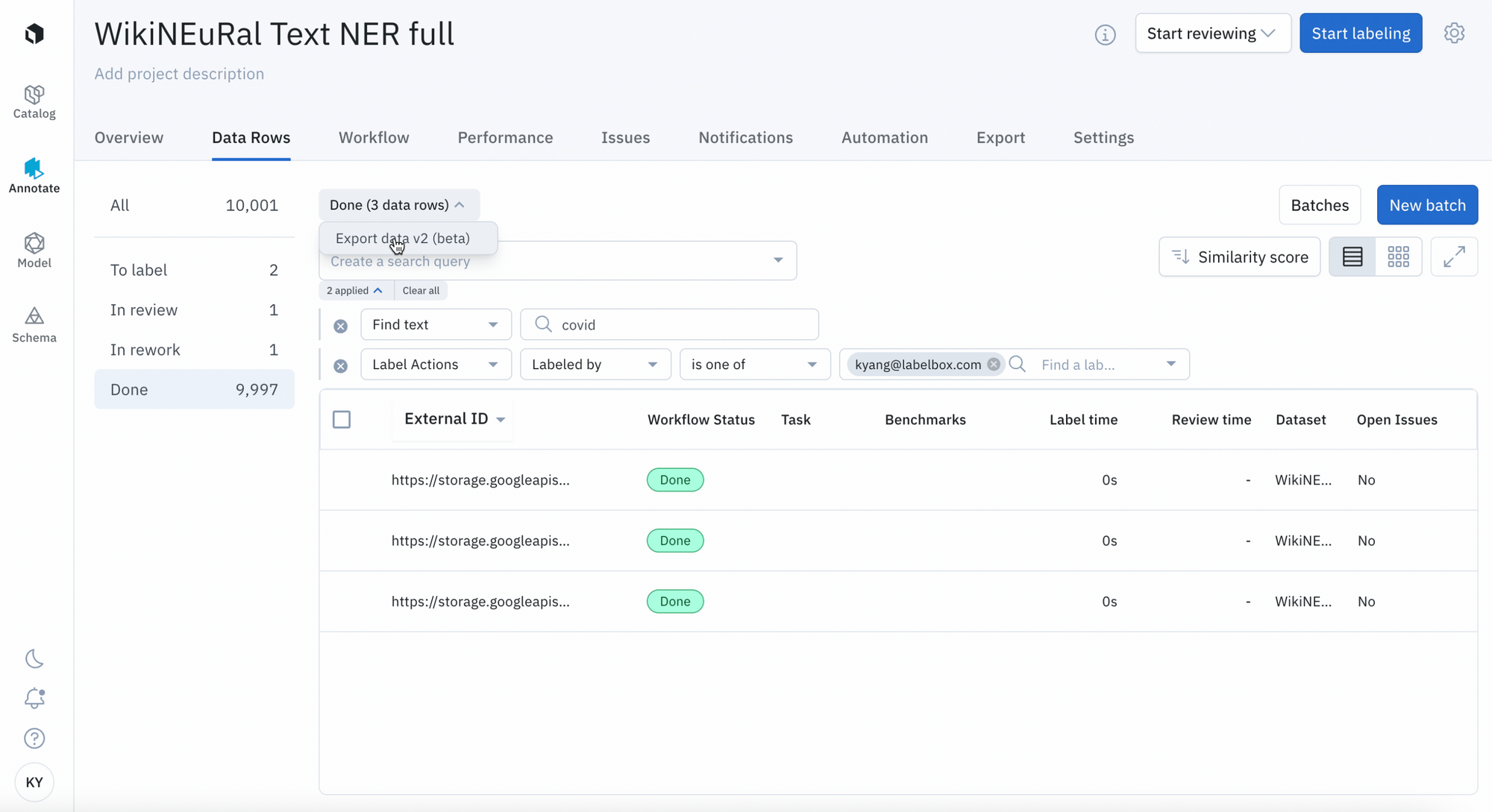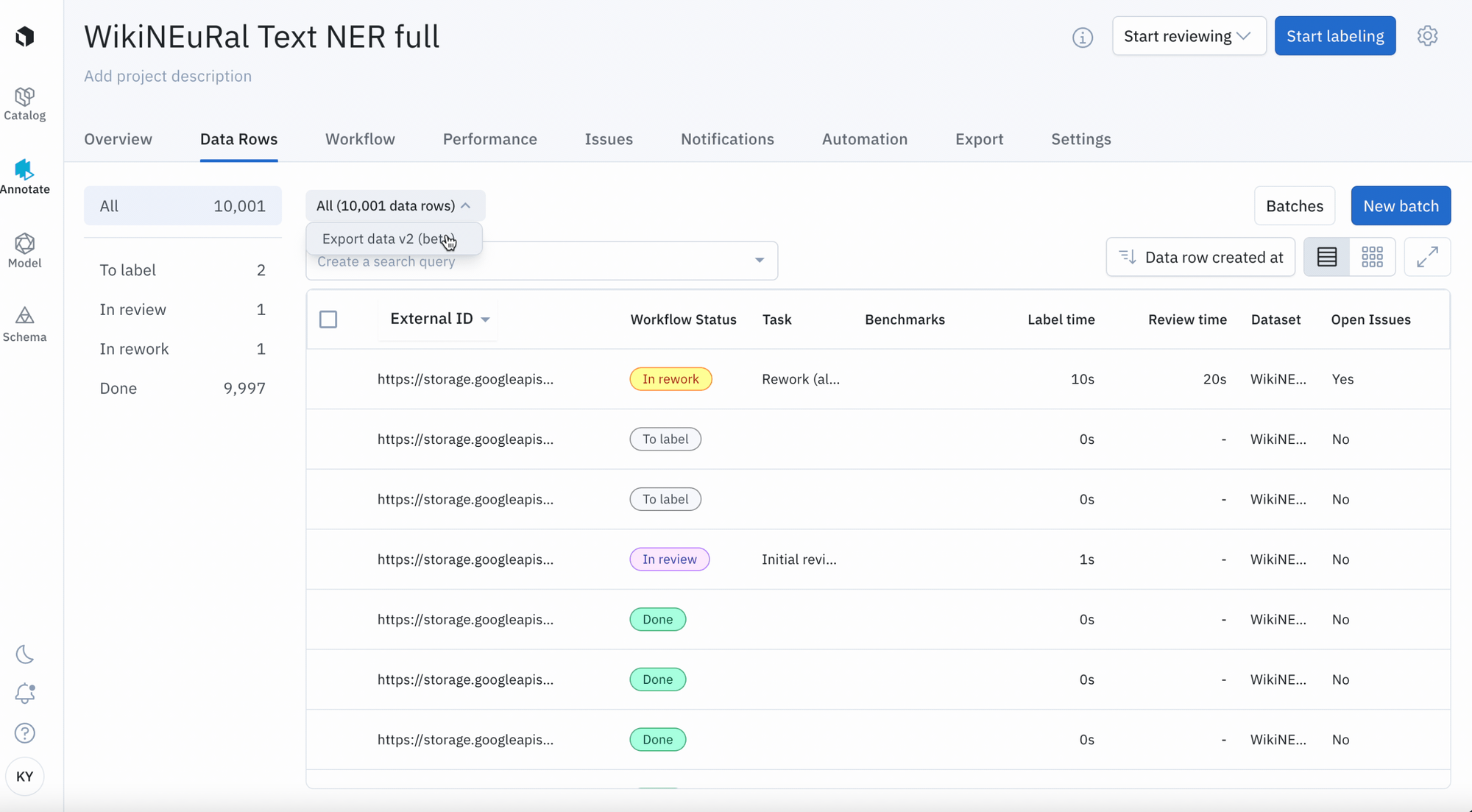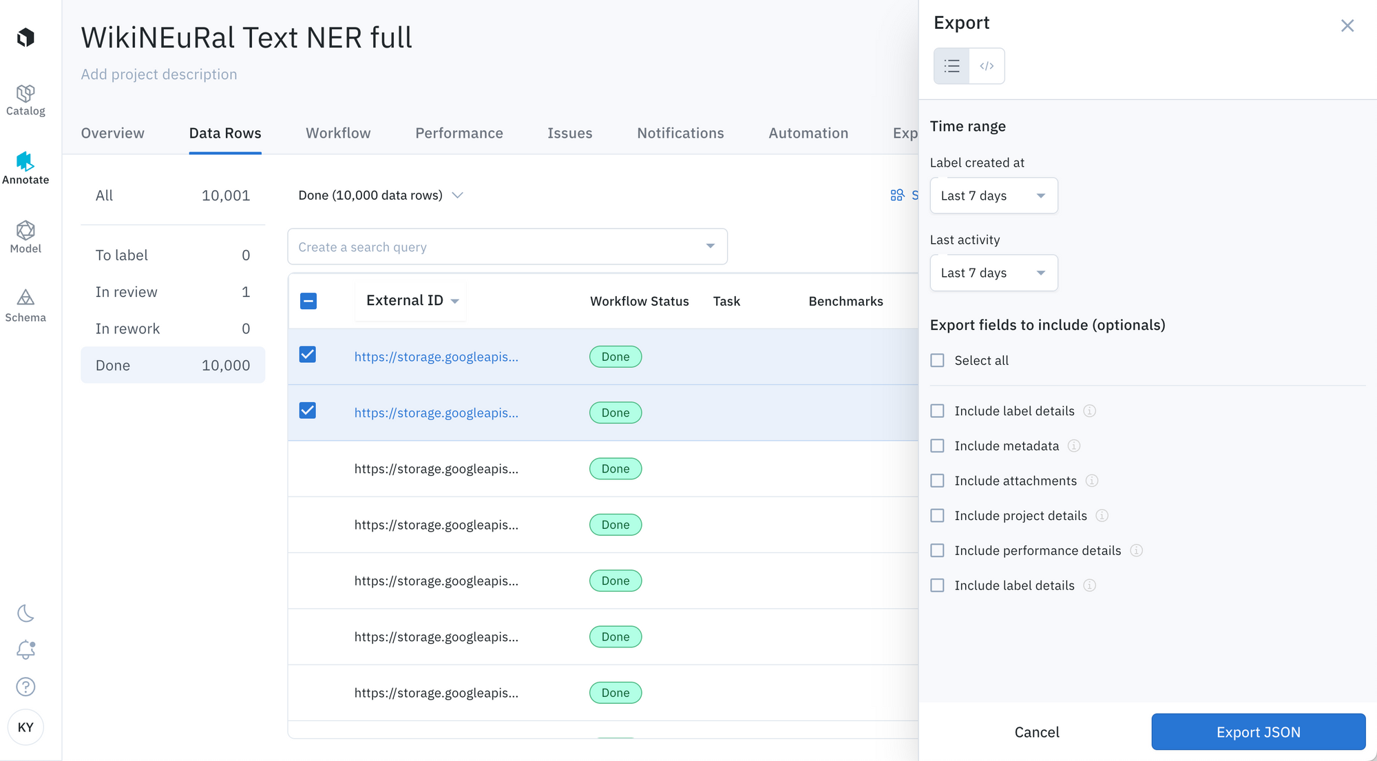 - Choose to export data rows based on 'To label', 'In Review', 'In Rework', or 'Done' statuses