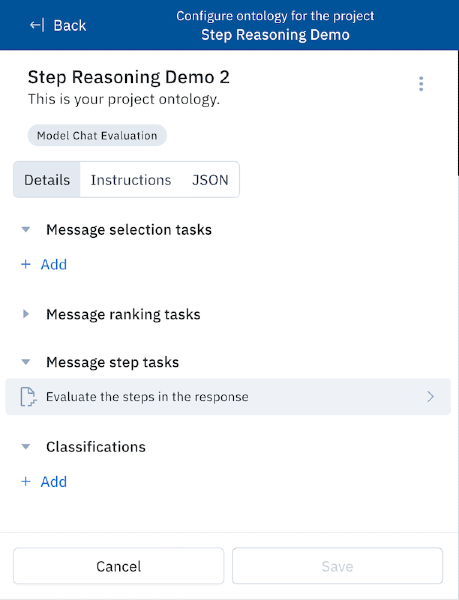 First, create a new project using the Multimodal chat task type, and then select or configure an ontology with a “Message step task” entered and saved. Other per-message, global classifications, and tasks can also be configured and used together with the new step reasoning tasks.