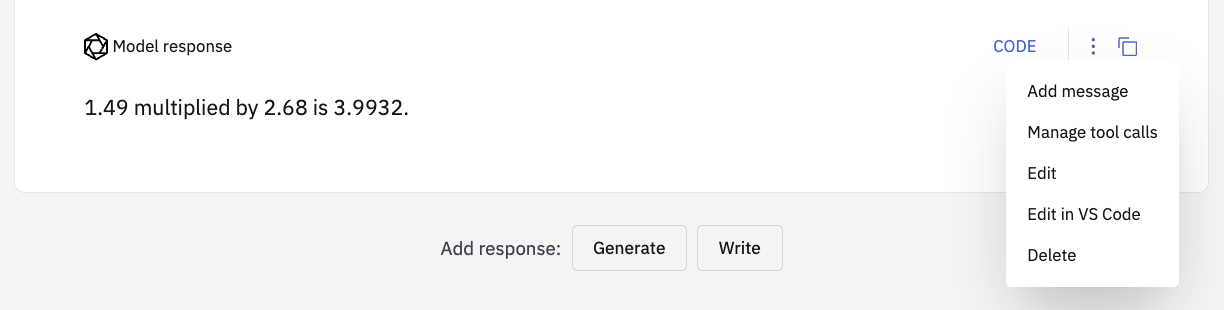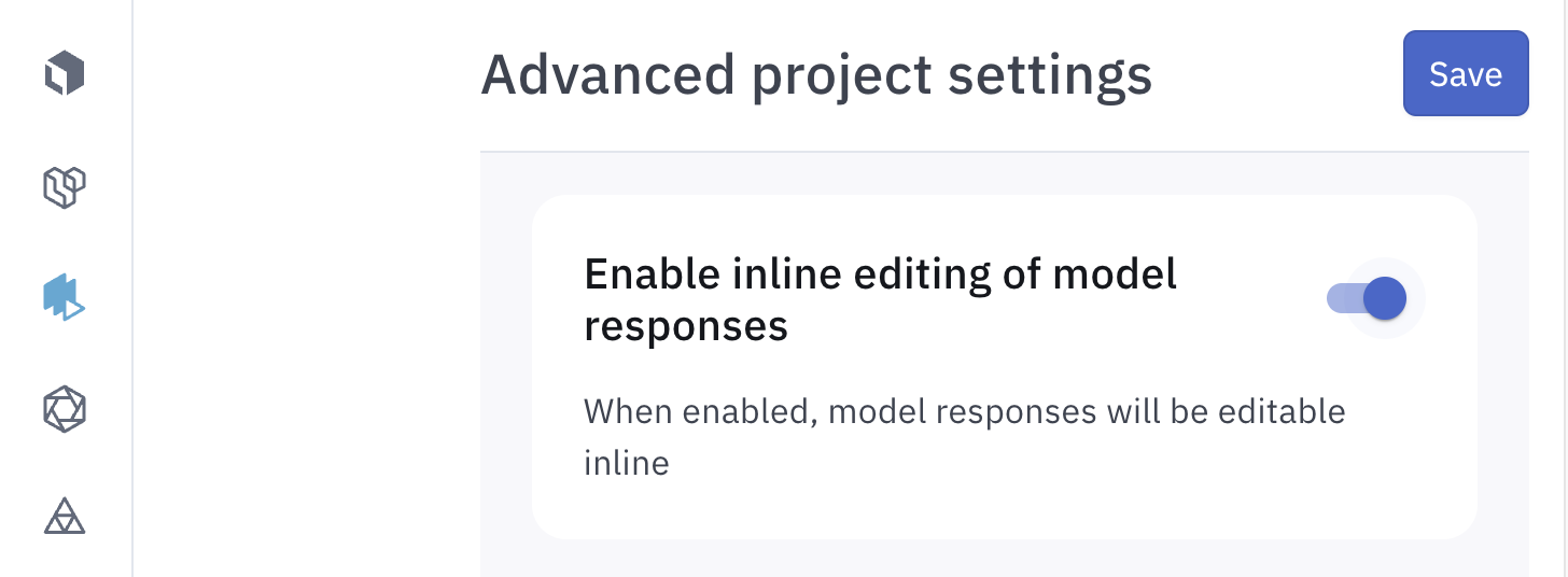 The multimodal chat editor also lets you correct model mistakes and create high-quality, ground truth trajectories which is ideal for training and fine-tuning. You can edit both tool calls and model responses to reflect the desired agent behavior. This feature can be enabled via the Advanced Settings tab for the project.