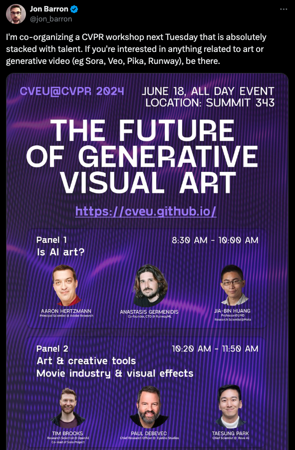 The workshop on generative visual art, part of the 4th AI for Creative Video Editing and Understanding (CVEU) series, focused on advancing machine learning technologies for creative visual content creation and understanding. It aimed to explore intuitive video editing tools, human-AI collaboration, reducing production costs, and addressing AI biases. The session featured speakers from top institutions and companies, including OpenAI, Carnegie Mellon University, Adobe Research, RunwayML, DeepMind, ByteDance, Google, Meta, Pika, and Eyeline Studios.