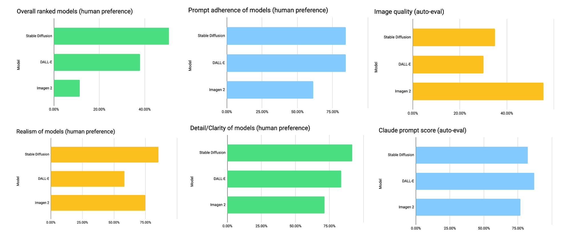 - Imagen 2 was ranked third (59%), while DALL-E and Stable Diffusion were ranked last less often (29% and 12% respectively