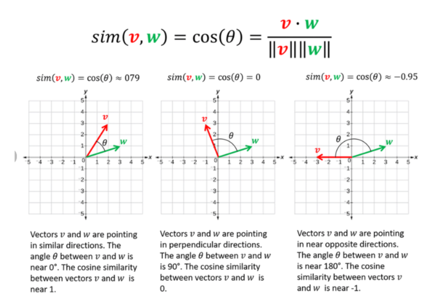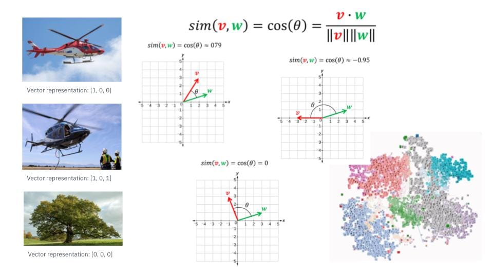 The most popular algorithm for measuring similarity between two vectors is cosine similarity. It calculates the angle between two vectors: the smaller the angle, the more similar they are. Cosine similarity scores range from 0 to 1, or -1 to 1 for dissimilarity.
