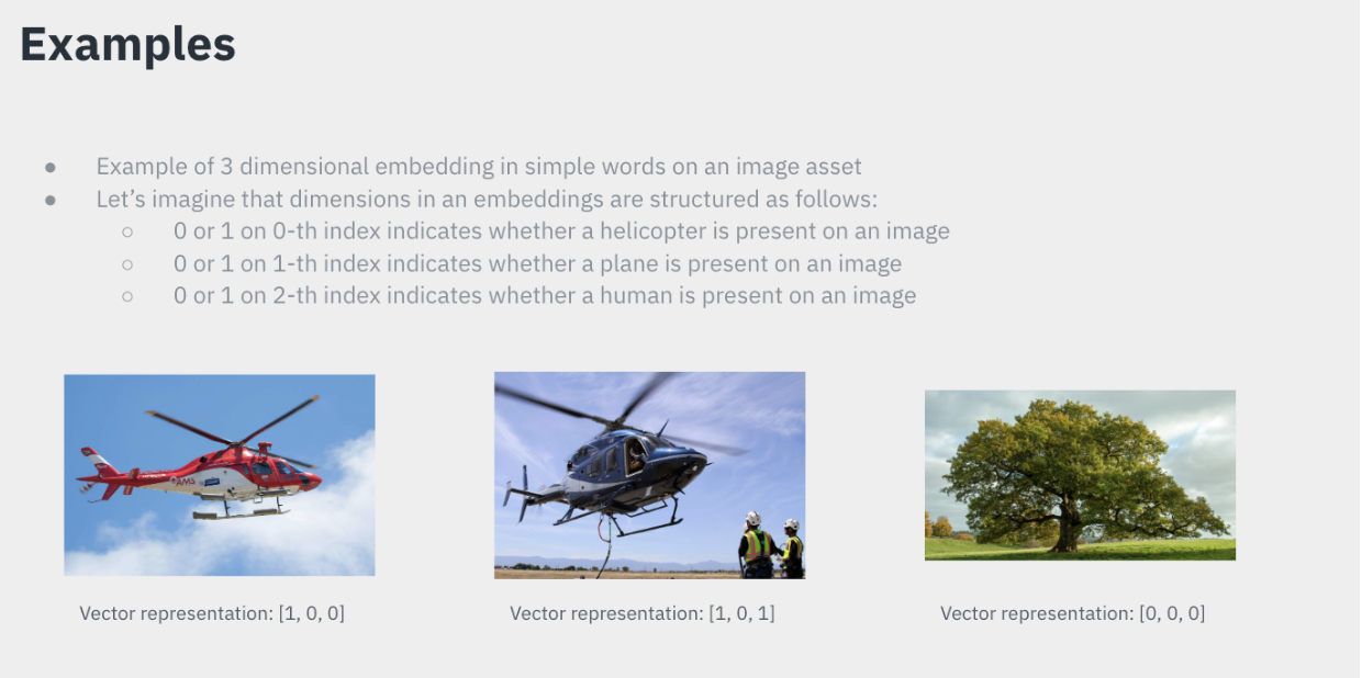 Another example: Let's consider a model trained on images of helicopters, planes, and humans. If we input an image of a helicopter, the model generates a vector representation reflecting this. If the image contains both a helicopter and humans, the representation changes accordingly. This process helps in understanding how embeddings are generated and used.
