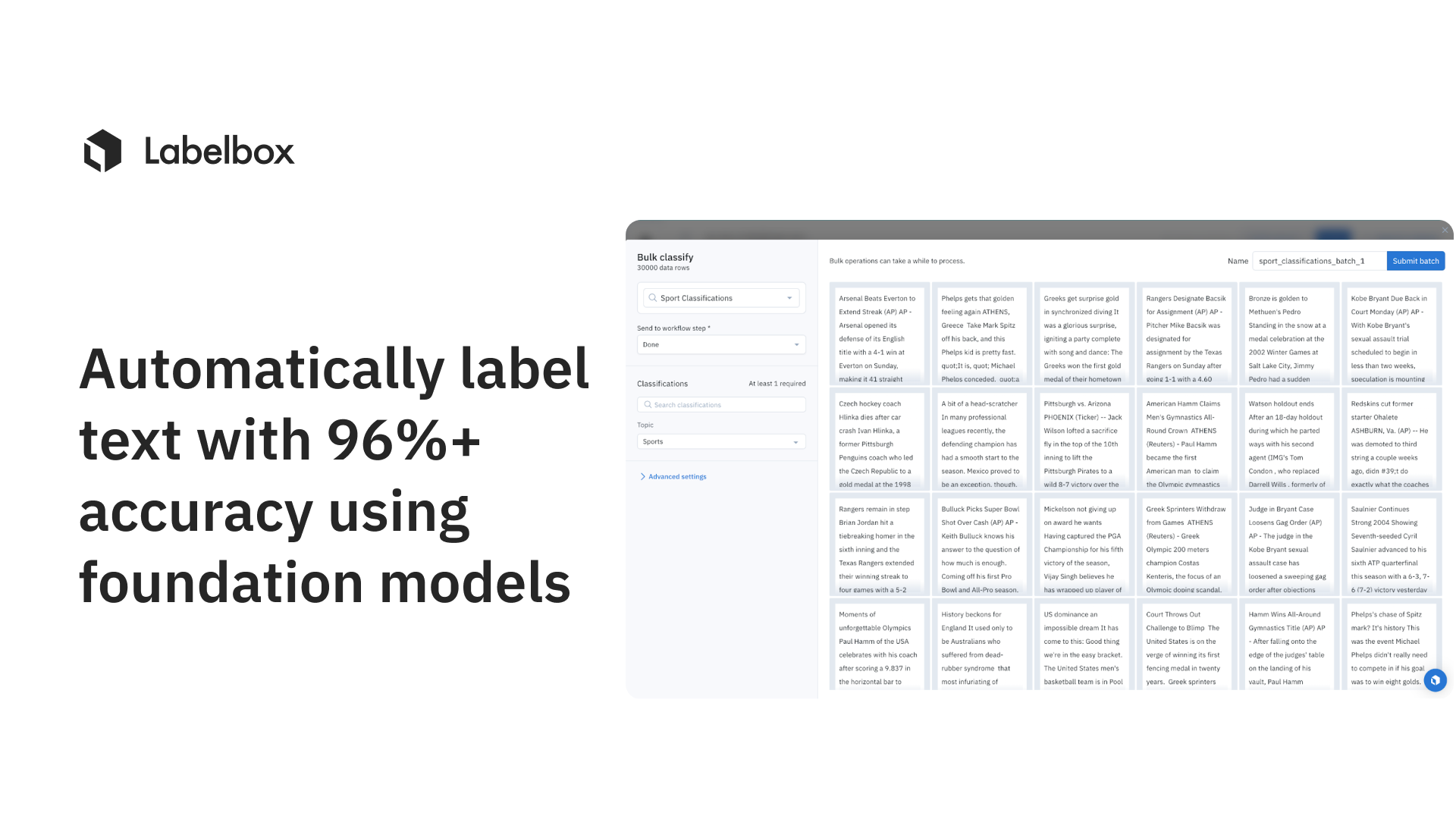 In this guide, you’ll learn how to exponentially increase your labeling speed and efficiency by leveraging Labelbox and foundation models. We will be walking through a text classification task: identifying news articles that talk about sports.