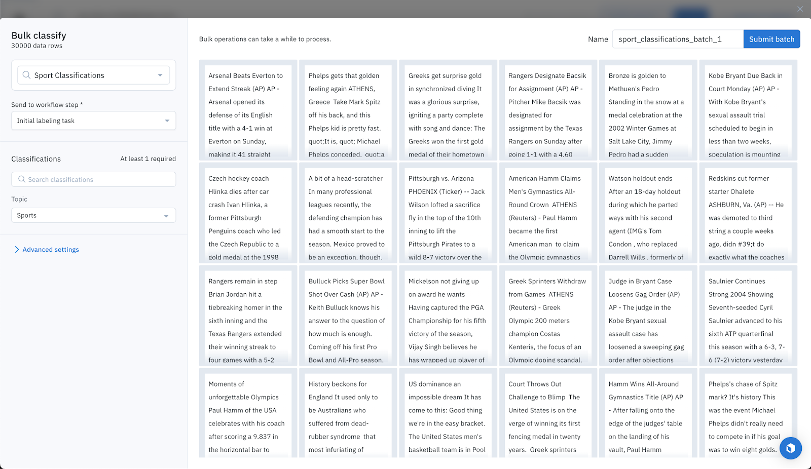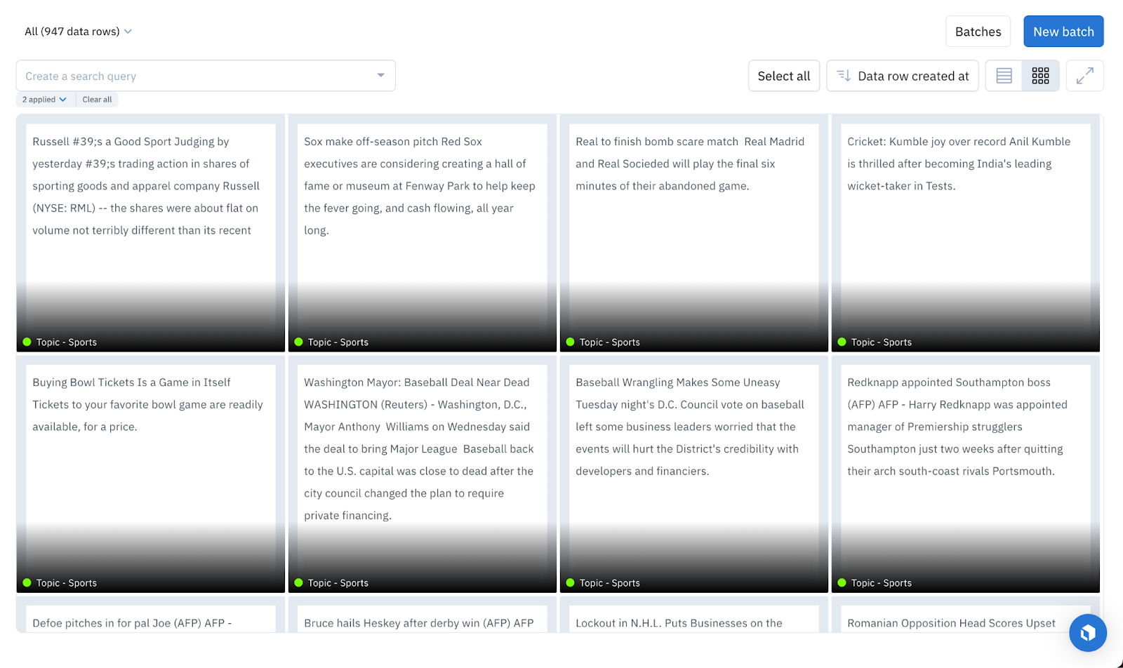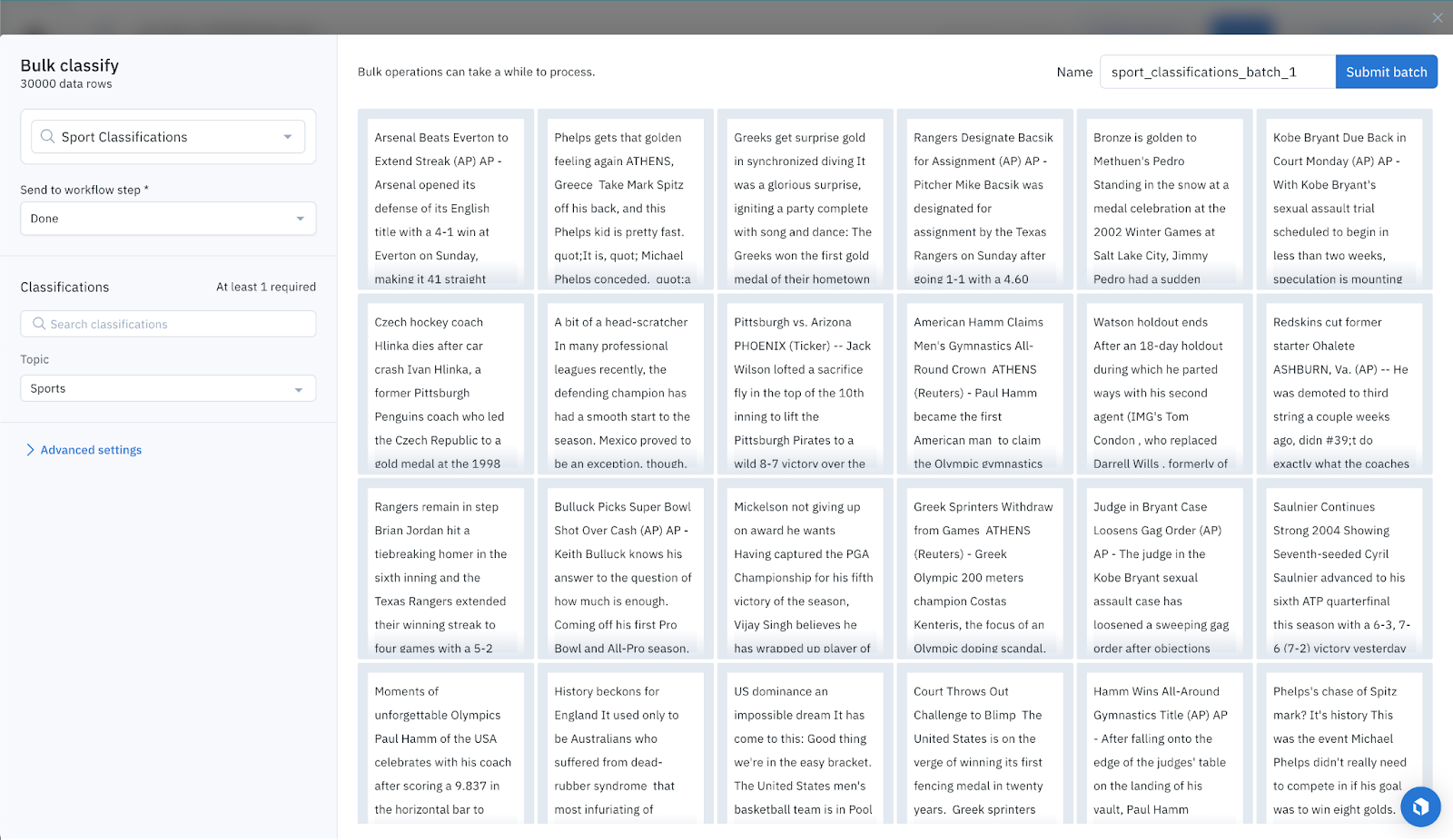 From there, it only takes one click to classify all of these text data rows as sports articles.