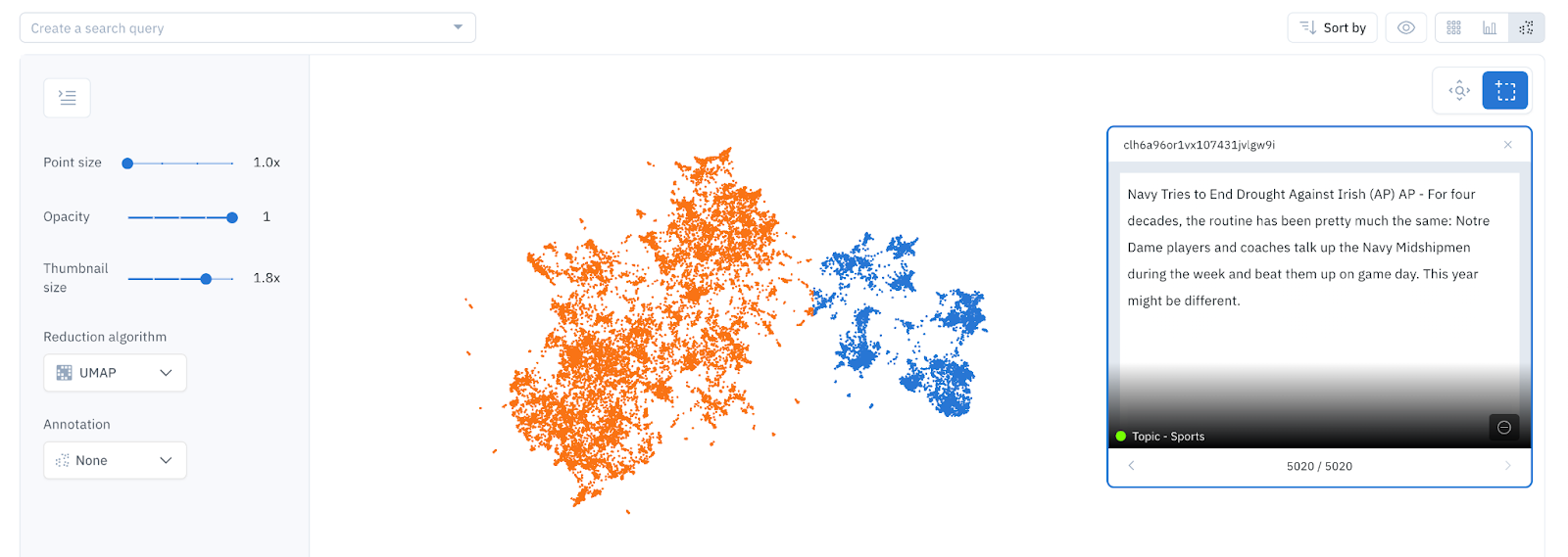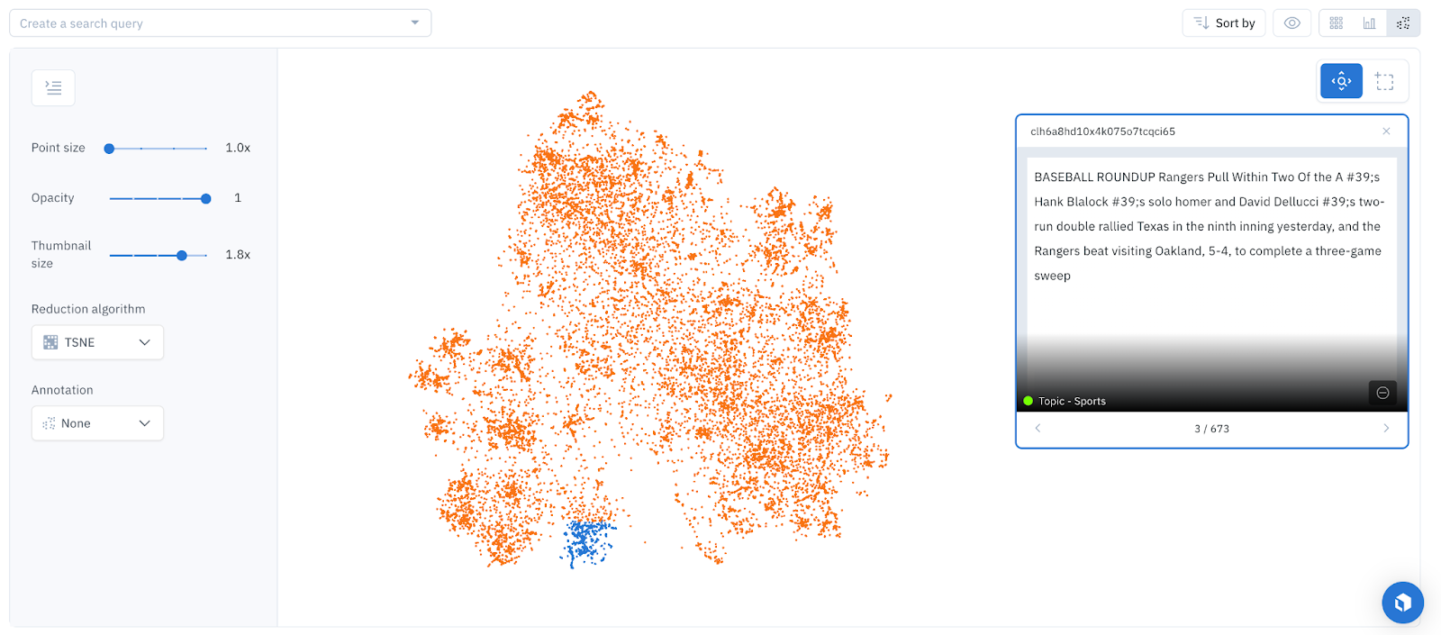 - The sports cluster in UMAP or t-SNE and a natural language search higher than 0.85. This results in 1,219 sports classifications, all of which are accurate except 58.