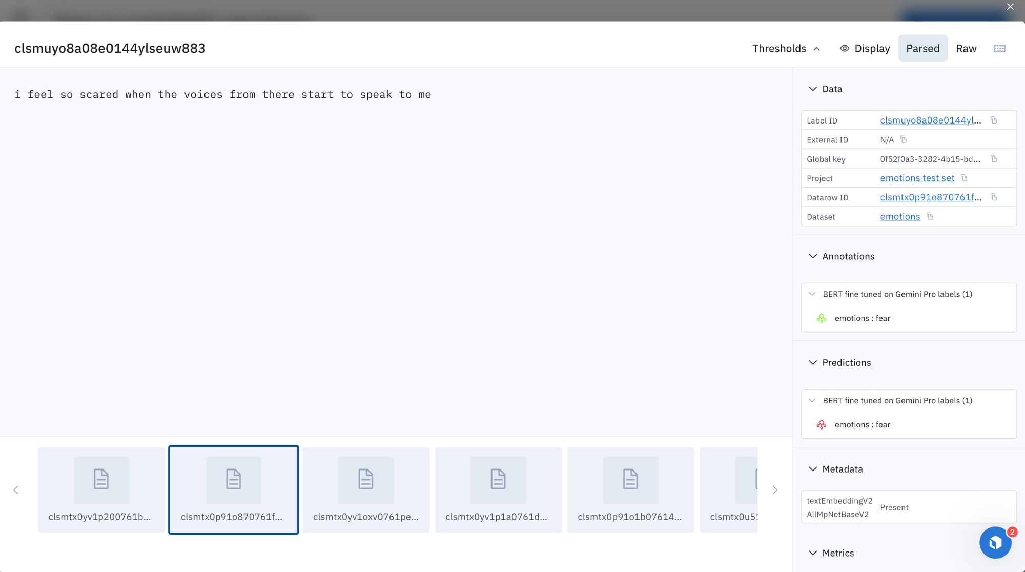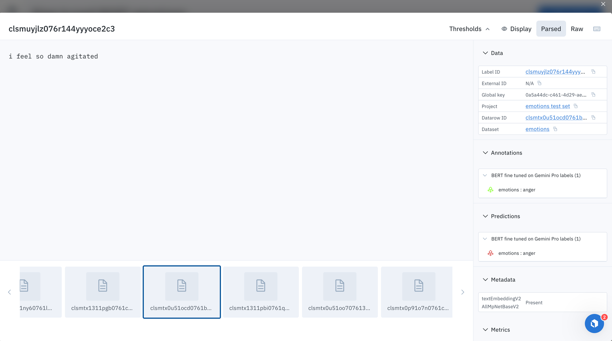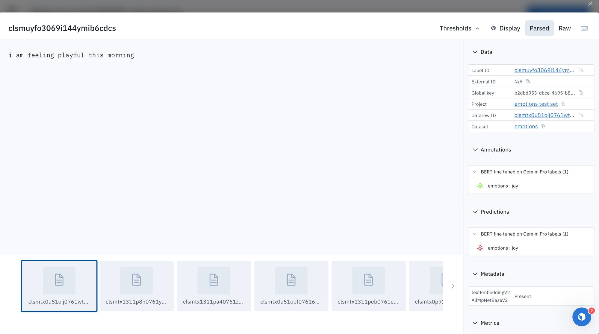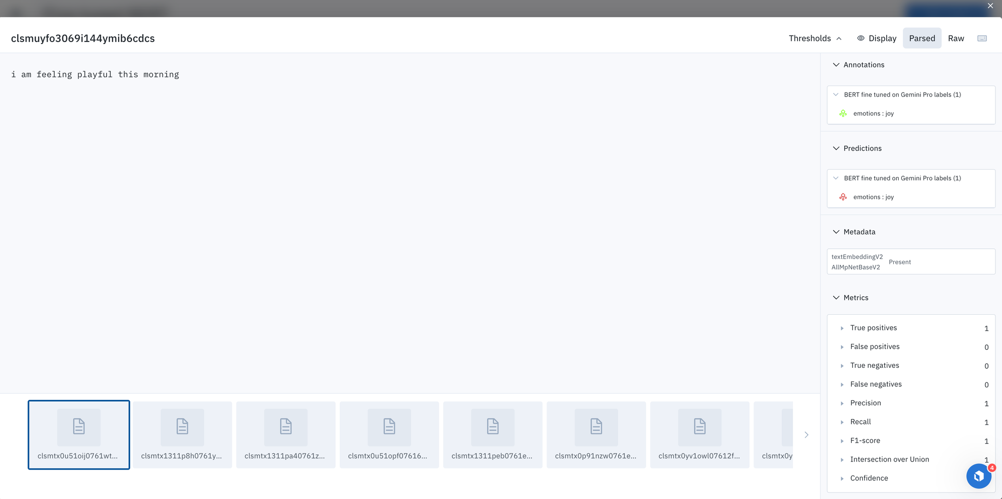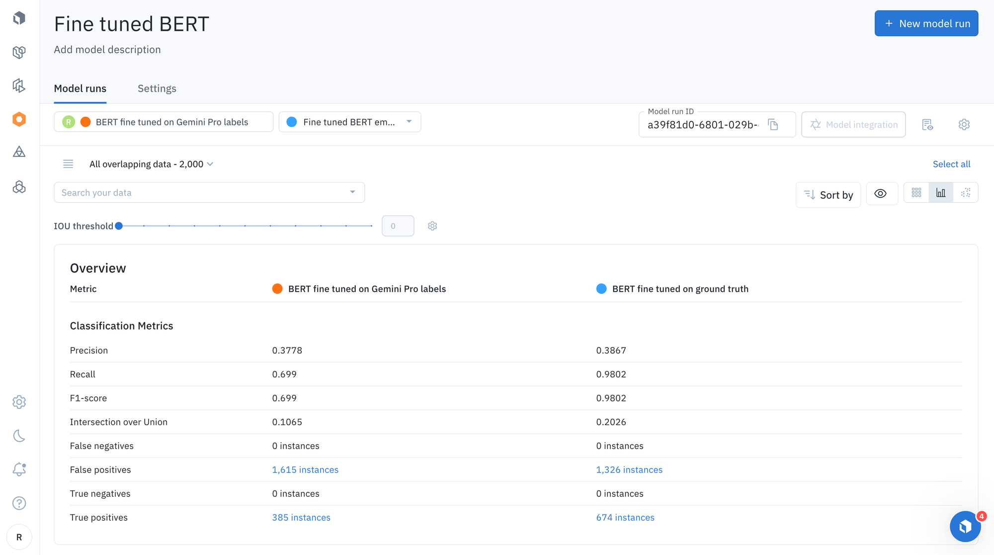 - You can then upload the ground truth labels (the labels generated by Gemini and used as the fine-tuning dataset) and the predictions from the fine-tuned BERT model to the corresponding Labelbox model.