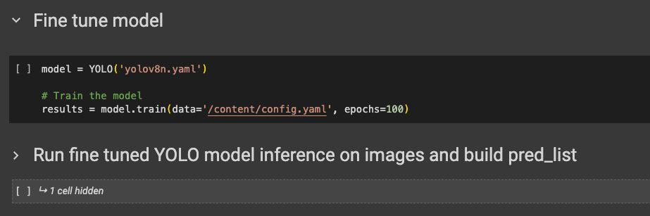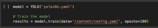 - In Colab we’ll instantiate a YOLO model and train it using the data, which includes both images and labels.