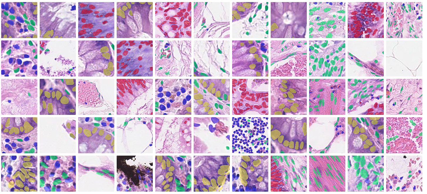 In order to understand the various nuclei categories that are present across the dataset, you can observe academic papers that accompany the PanNuke dataset - in the case of Colon organ images, we will look to annotate 5 main categories: Neoplastic, Connective, Inflammatory, Epithelial, and Dead Cell nuclei.