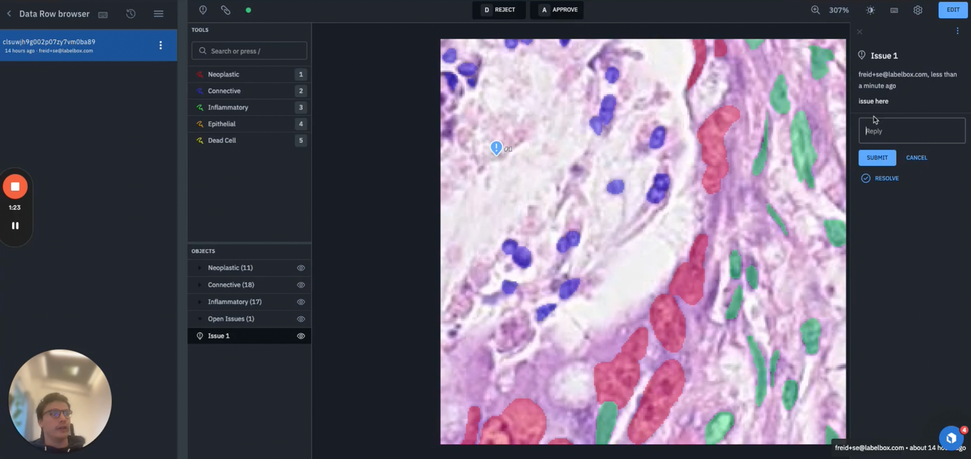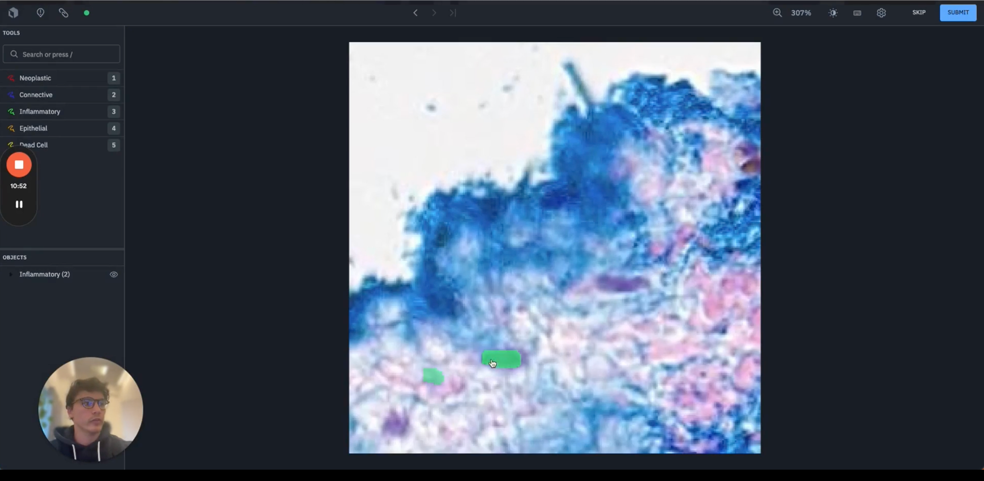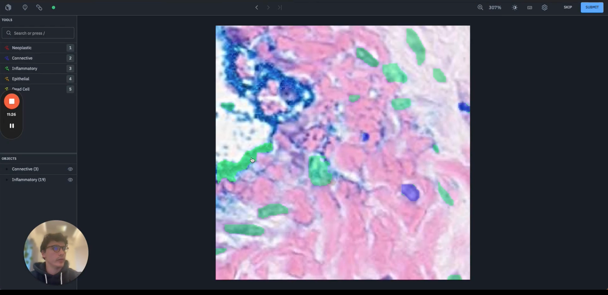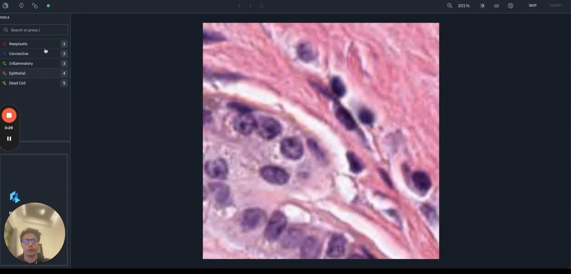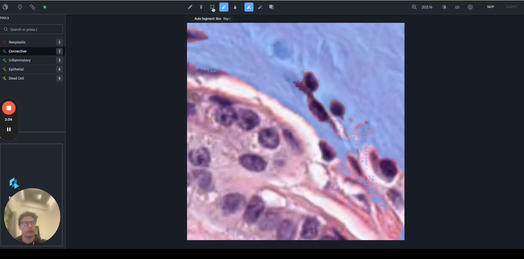 Once appropriately annotated, you can go ahead and click "submit" and you'll now have all your pre labels showing over several nuclei of interest which can be simply validated, as shown below.