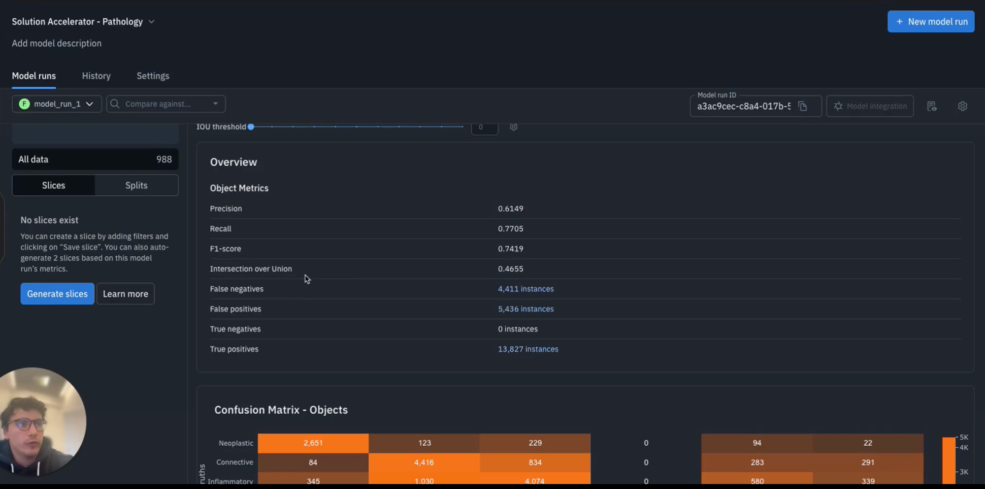 This gives you a more granular view of how your model is performing. You can also navigate to the metrics tab in the top right. As shown below, you will see a view of various metrics from precision recall F1, and in the case of segmentation and object detection, intersection over union (IoU).