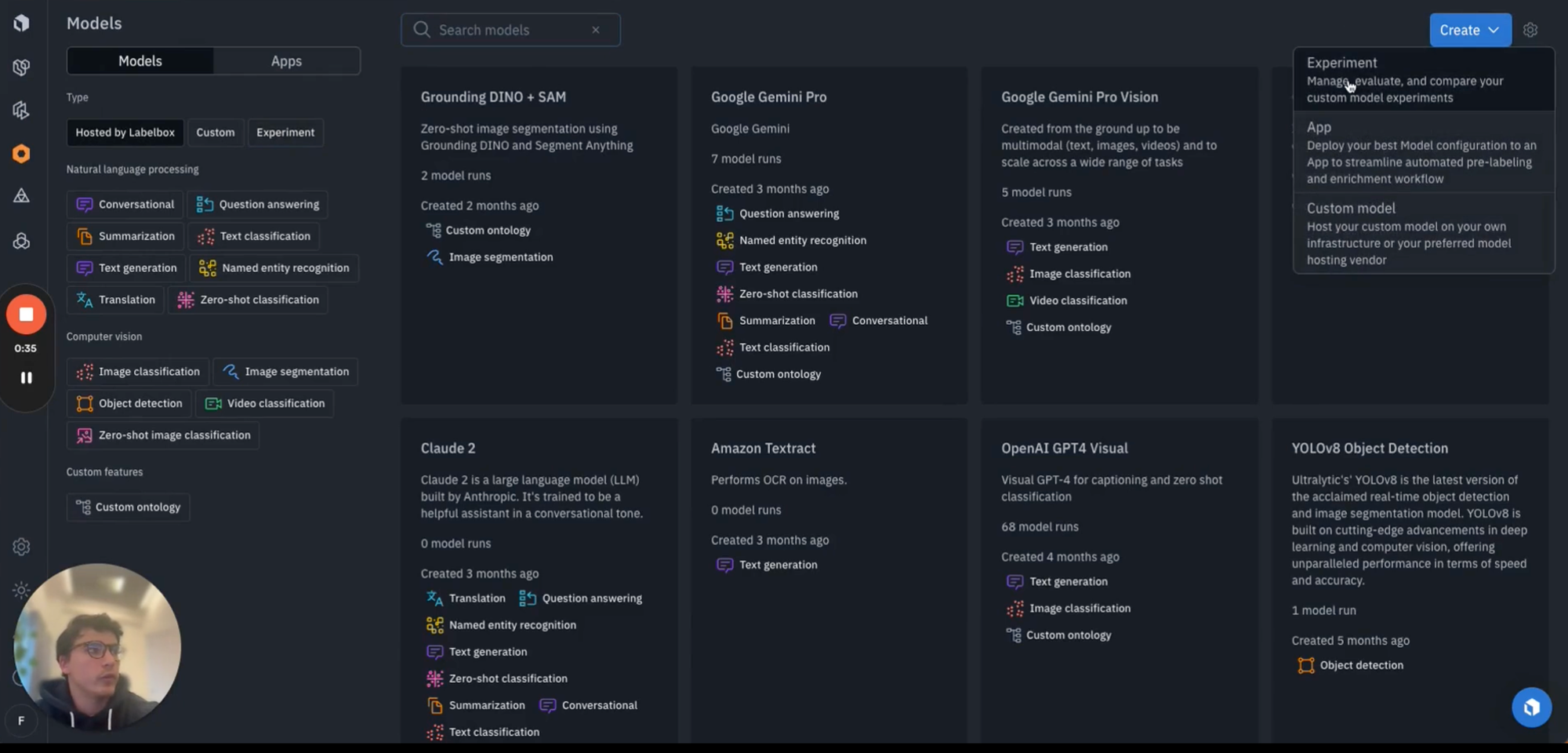 You'll see the custom YOLO-V8 model that we have trained as part of the accompanying notebook. This allows you to proceed to the model run UI where you can configure your ontology, as well as various parameters of our model run. You can also save this as an app for repeatability in the future, or you can generate previews on a sample of five or less to see how your model is performing as shown below.