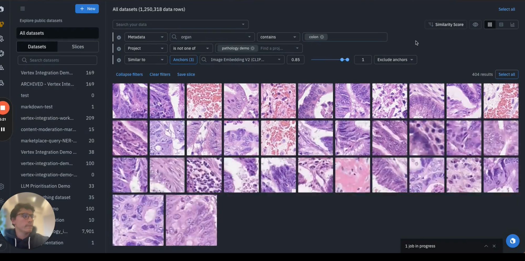 In this demo, we'll be using Catalog to find relevant images of histopathology images for our dataset by taking samples of tissue cells that are stained and subsequently analyzed under a microscope - with trained pathologists identifying cancerous regions through visual inspections. AI models are increasingly being used to perform the visual inspection in order to accelerate this manual and time consuming activity, as well as reduce observer variability.