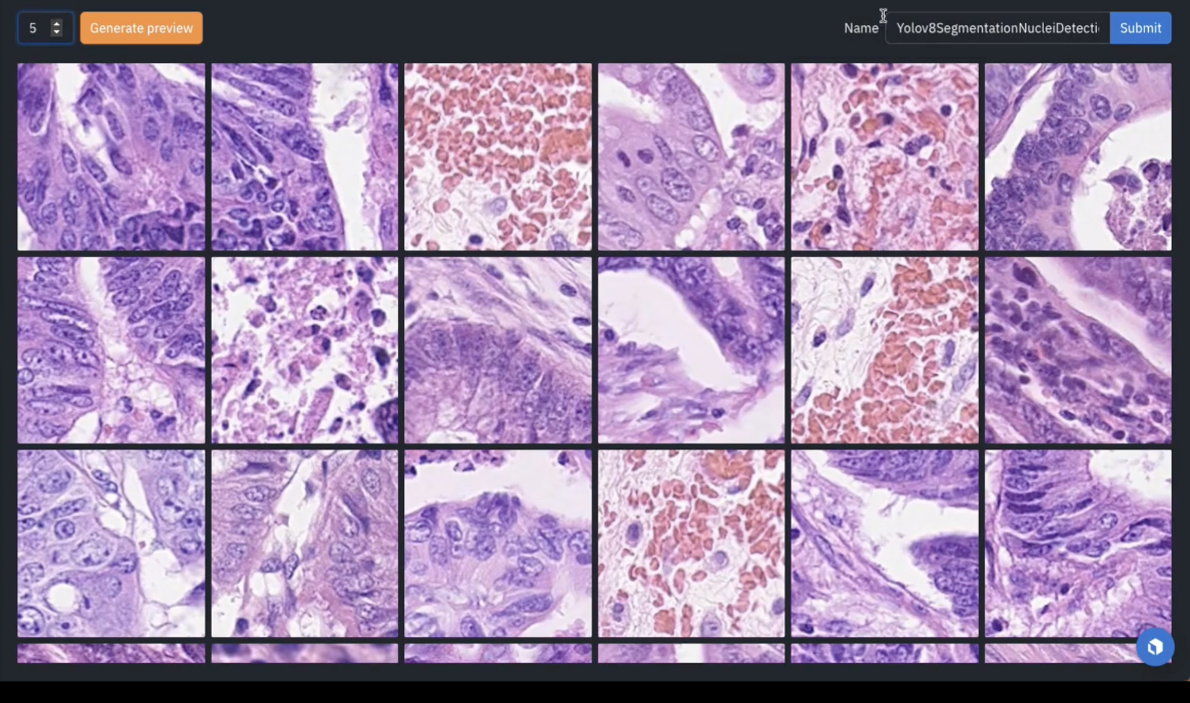 For this tutorial, we’ll be working with a dataset of histopathology images – with the goal of identifying cancerous regions through visual inspections. These images were taken from the open source PanNuke dataset, first published by researchers at Warwick University. The raw image dataset comes in the form of a numpy array of pixels, and first needs to be converted to jpeg stored as objects on your cloud storage. The steps taken to achieve this can be found in the Python notebooks that accompany this demo.