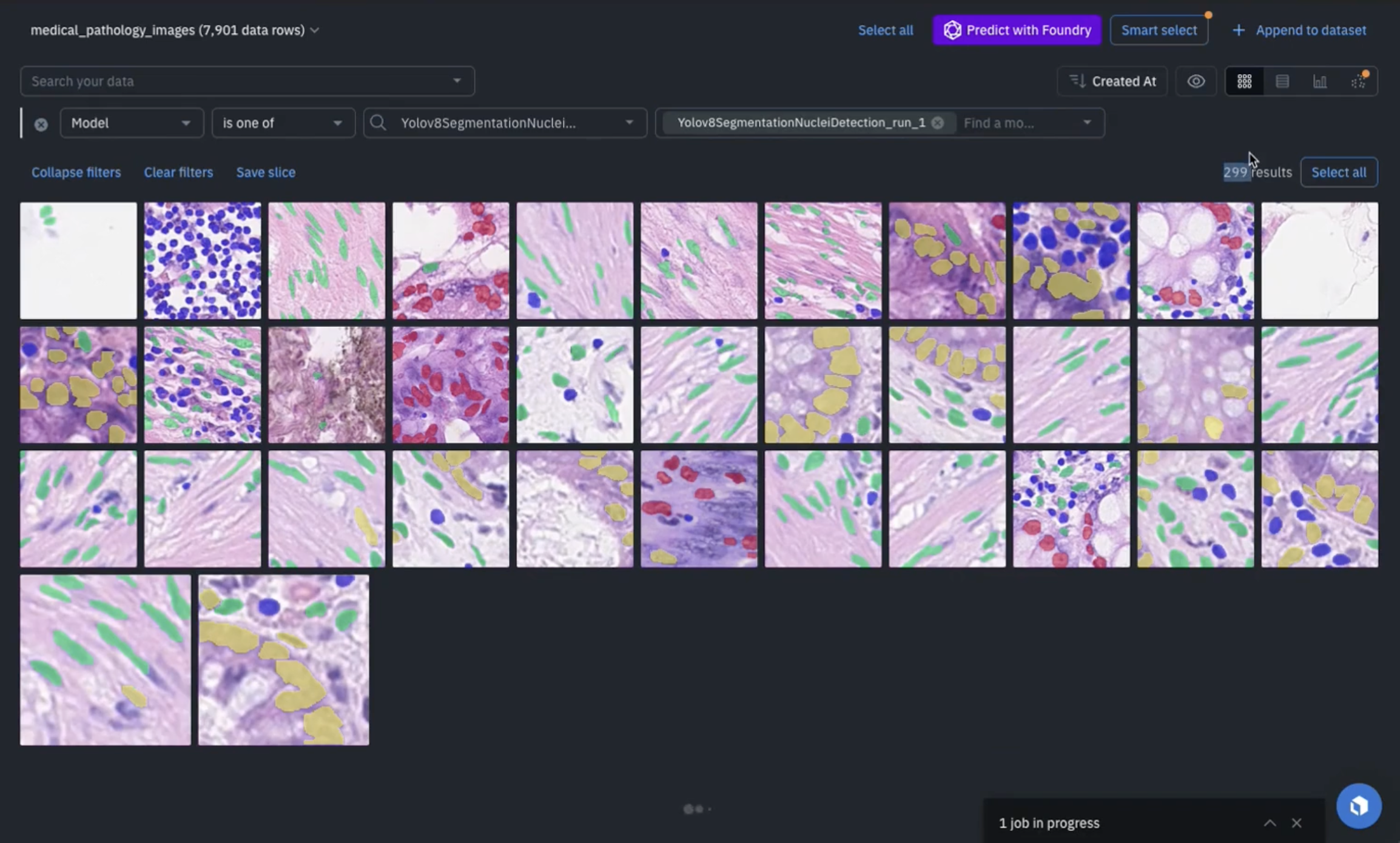 You'll need to wait a few moments before this is complete. Once your model run is complete, you can navigate back to your dataset within Catalog, and filter for your model run which narrows down to a subset of your data for which nuclei were detected (in this case roughly three hundred). Next, select all of these data rows and you can leverage the "Send to Annotate" feature to include these model predictions.