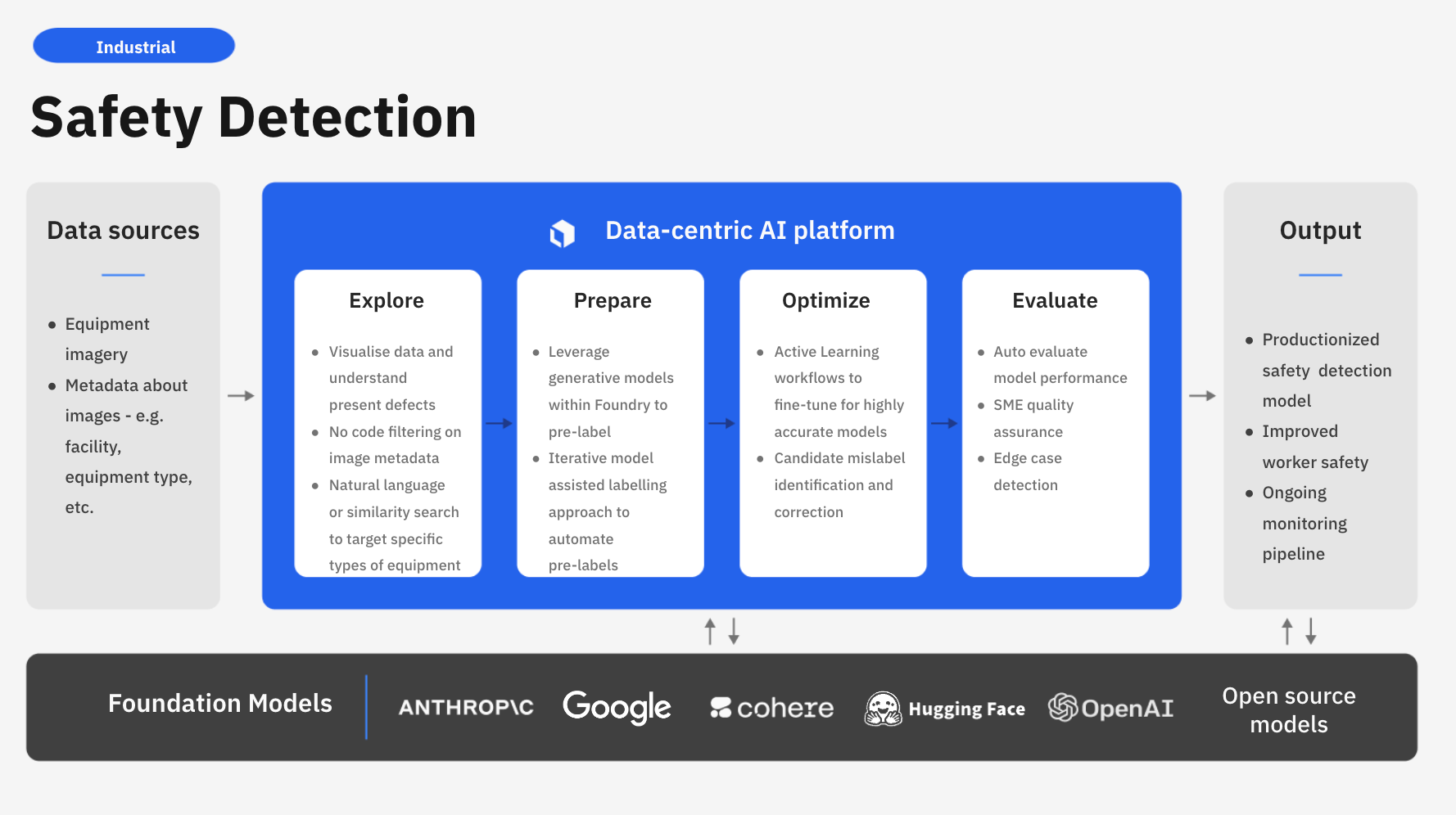 - Cost & scalability: Developing accurate custom AI can be expensive in data, tools, and expertise. Leveraging foundation models, with human-in-the-loop verification and active learning, can help accelerate model development by automating the labeling process.