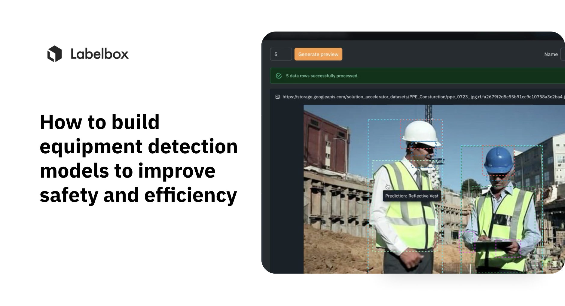 In this guide, we’ll walk through an end-to-end workflow on how your team can leverage Labelbox’s platform to build a powerful task-specific model to improve safety detection using personal protective equipment as an example. Specifically, this guide will walk through how you can explore and better understand your visual assets to make more data-driven business decisions for worker safety.