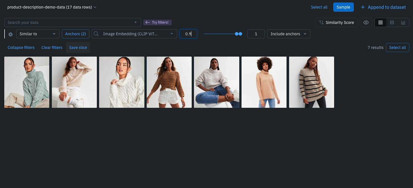 Leverage custom and out-of-the-box smart filters and embeddings to quickly explore product listings, surface similar data, and optimize data curation for ML. You can: