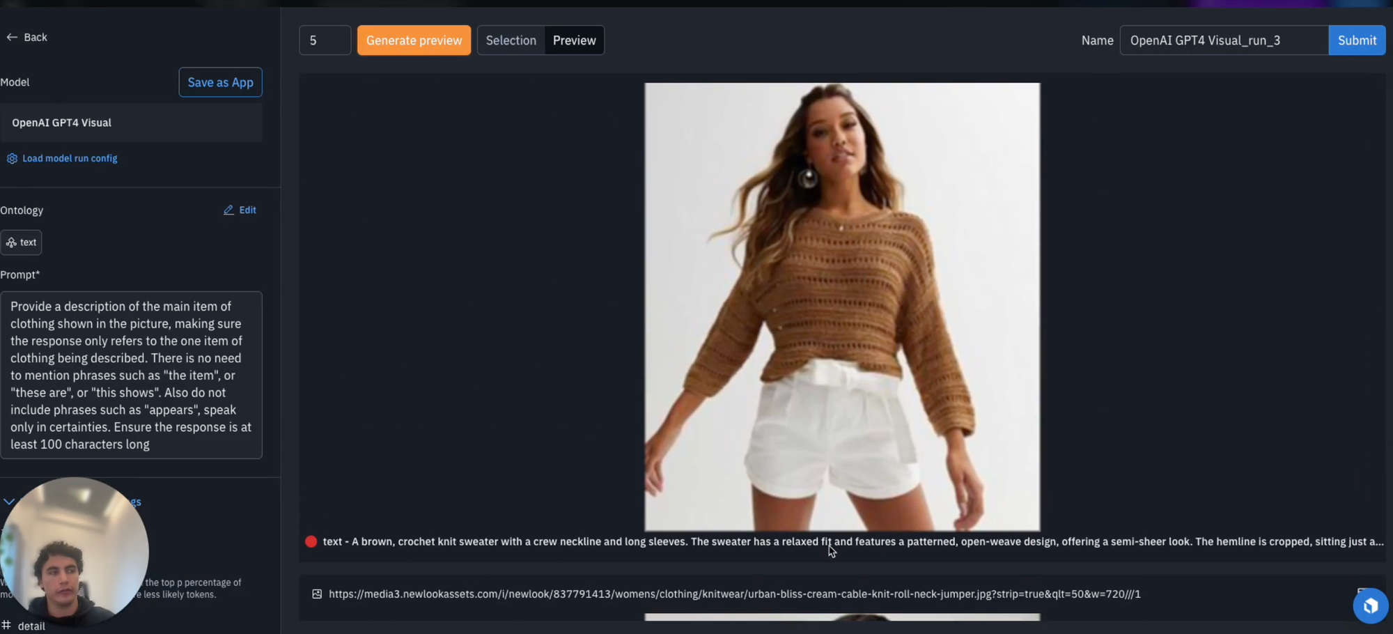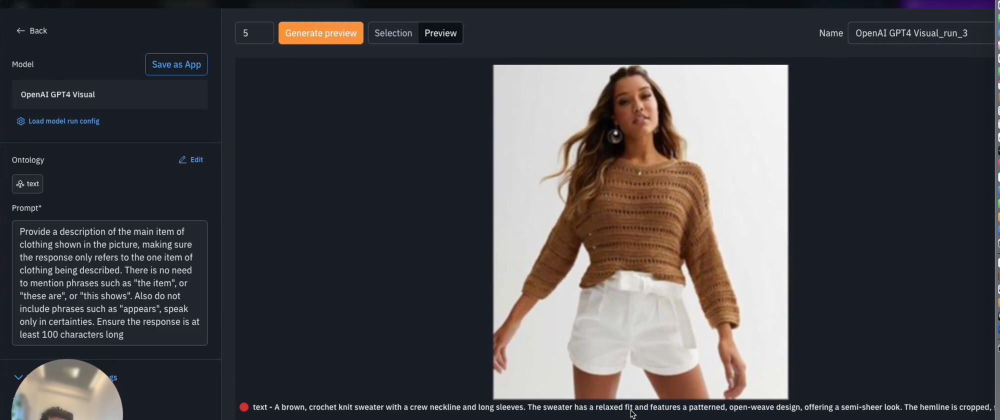 Here, we asked the model to create a description for the main item of clothing shown in the picture and asked it to exclude words such as "the item", "these are" or "this shows", and also to speak in certainties by ignoring such phrases as "it appears". We also ask for a specific prompt response length.