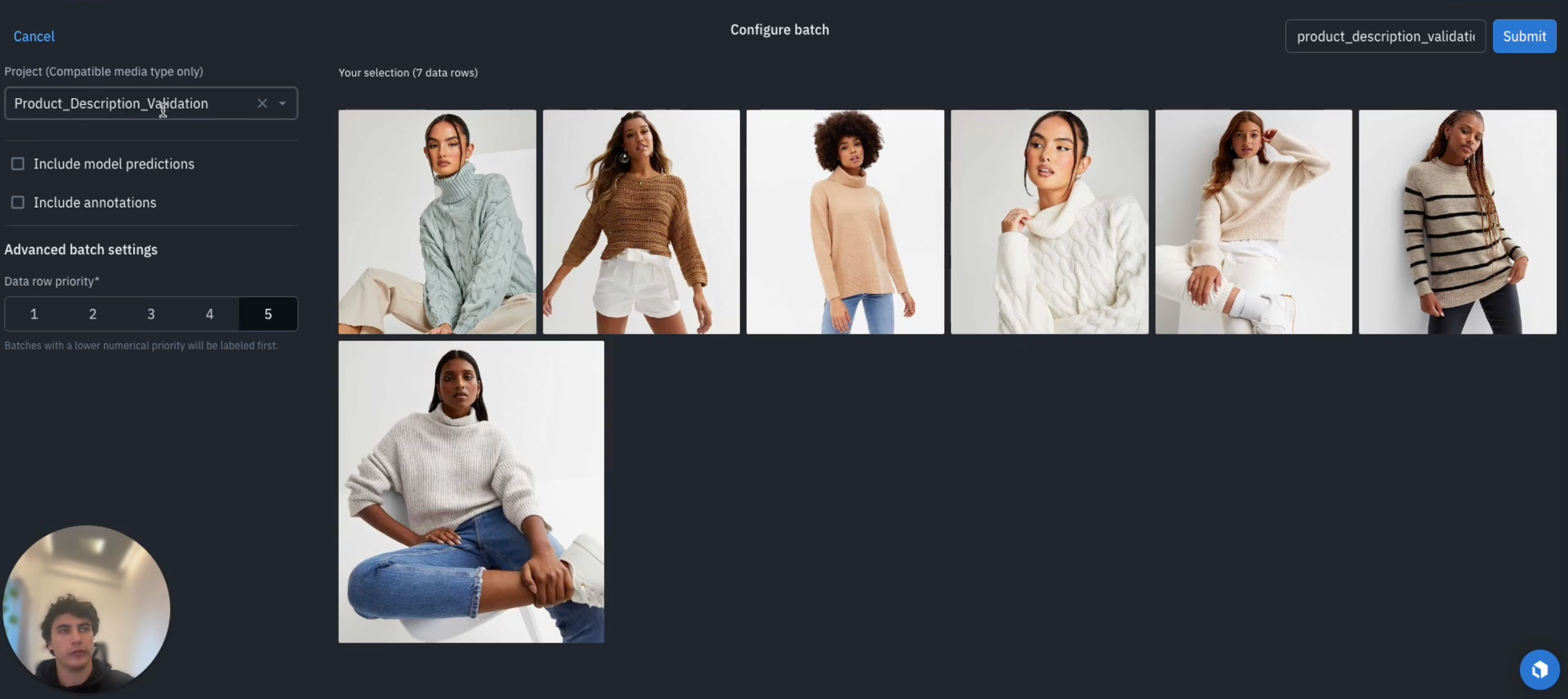 We can continue with this workflow until all of our data rows have been processed with a human-in-the-loop review. The advantage of this approach is that it allows you to validate whether or not the model is performing is expected, offering a certain level of security by having domain experts assess each of the product descriptions before they go live on your website or app.