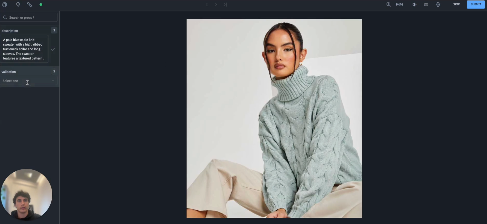 We can see above that the description provided, "a pale blue cable knit sweater with a high, ribbed turtleneck collar and long sleeves" appears to be appropriate so we may not need to edit it and can simply hit "Accept".