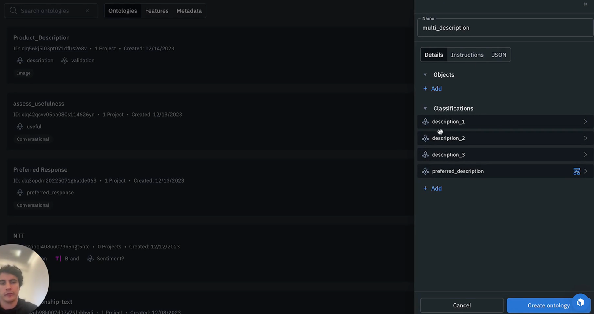 3) As a next step, let's select an ontology. We're going to want to edit this ontology because we're not interested in asking the model to provide the preferred description but simply to output each of the three descriptions. To do so, we can click "edit", then we can ignore the preferred description option. Clicking "save" will update the automatically generated prompt before and we can add some additional information via prompt to direct the model in our desired manner.