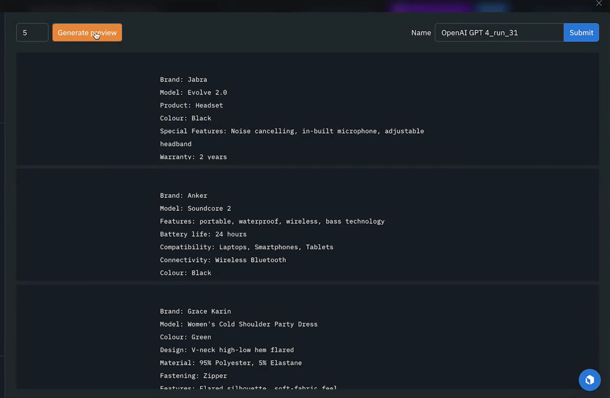 4) As shown above, we'll be asking the model to provide three different output descriptions based on the input specifications provided. We can then edit any of the parameters available to us as required and once we're ready, we can generate the preview as shown below.