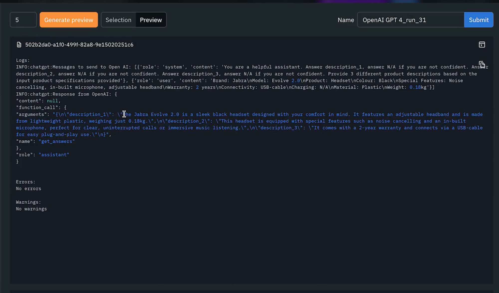 5) After we've generated our preview, we can begin to explore each of the outputted results for the sample of five data rows. To see the full response, we can navigate to to "view log" and see the outputted response from our model which has provided three different descriptions. As it appears the model is performing as expected and we can now execute the full model run (as shown below).