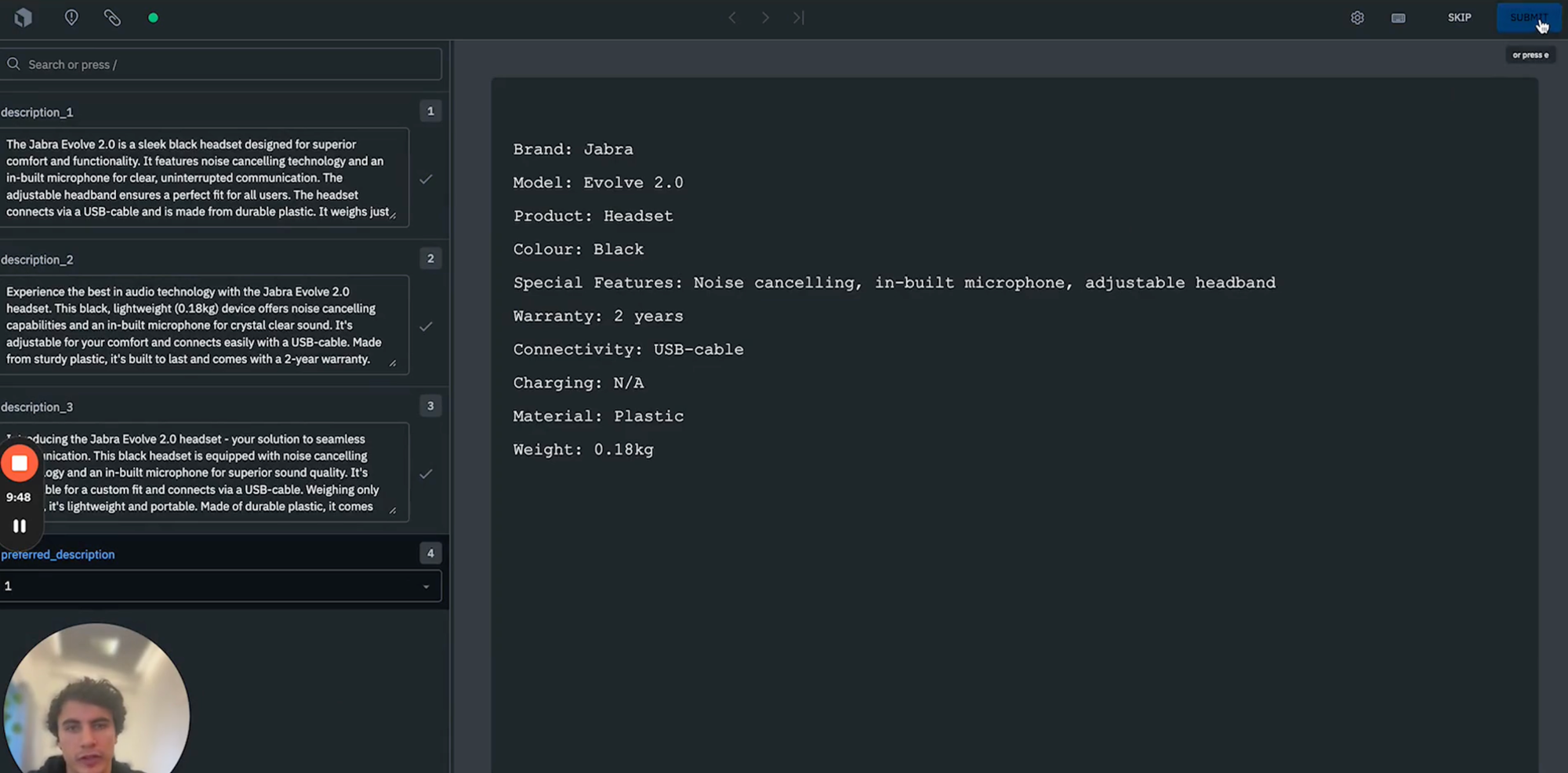 We can continue with this workflow until labelers have reviewed and assessed all data row descriptions. This allows us to build a dataset ready to extract and identify preferred descriptions and pass these description downstream for whatever use case is required such as inclusion on the product listing of our website.
