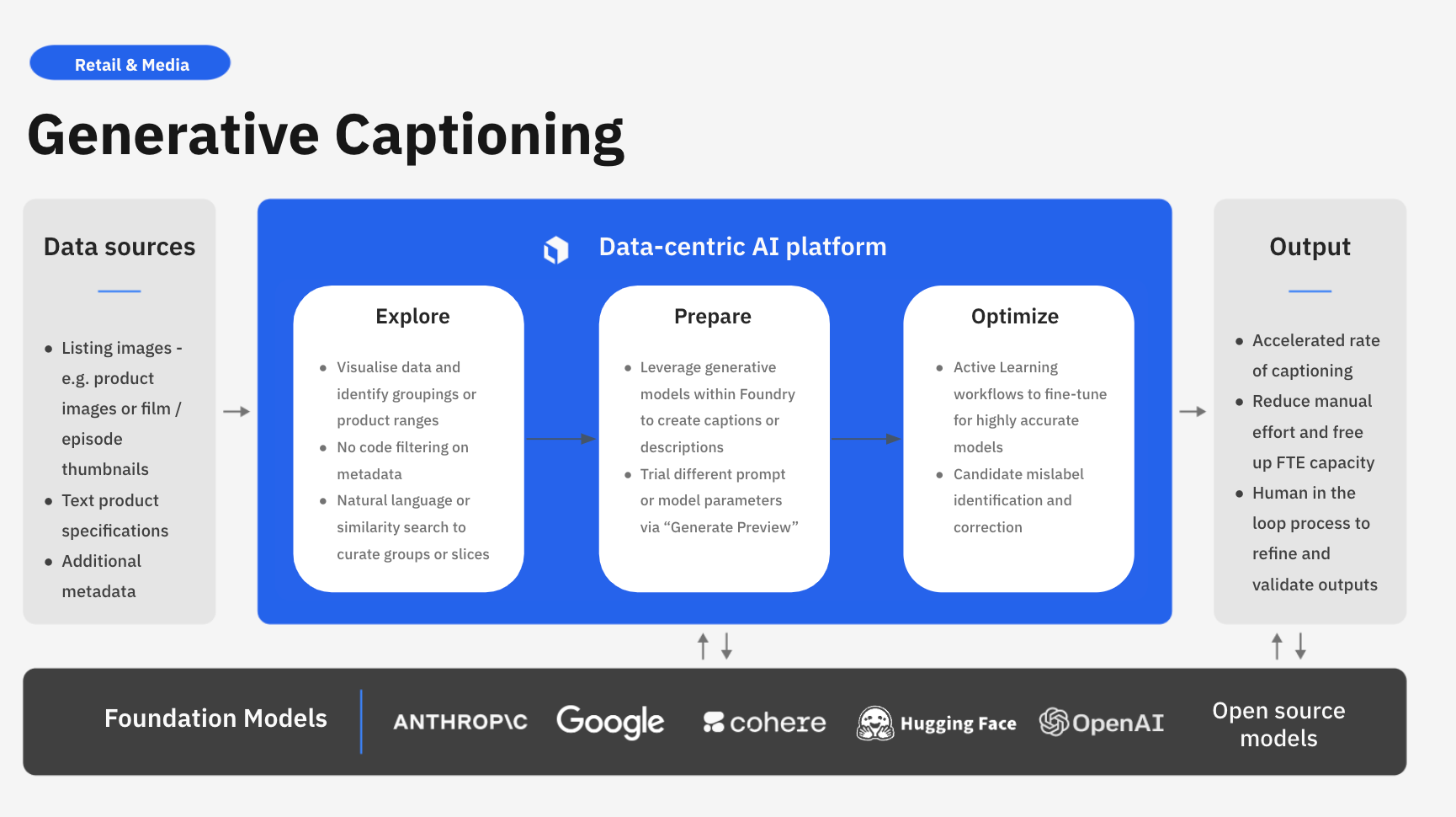 The rise of foundation models has enabled companies to seamlessly enrich all of their products and services with rich captions and descriptions in minimal time and with little human effort required. Organizations can now use AI taught to automatically generate descriptions for product listings based on a wide range of images or product specifications. By incorporating a powerful generative captioning system, companies that span retail and internet & media can now readily enhance customer assets and foster stronger connections to boost customer loyalty and increase key metrics such as conversion rate, engagement, and average order value.