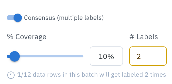 When adding a new batch of data to your labeling project, you have the ability to enable or disable consensus for that batch, configure and set batch-specific priority, coverage, and the number of labels.