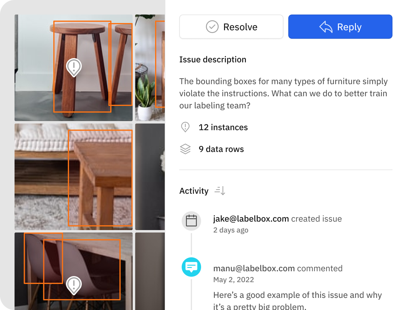 Labeling data is an inherently collaborative process that requires continuous feedback between labelers and reviewers to ensure high-quality outcomes. You can make use of issues & comments on the Labelbox platform to quickly pinpoint and share written feedback directly on the label. This feature also supports two-way communication, allowing labelers to respond or ask clarifying questions.