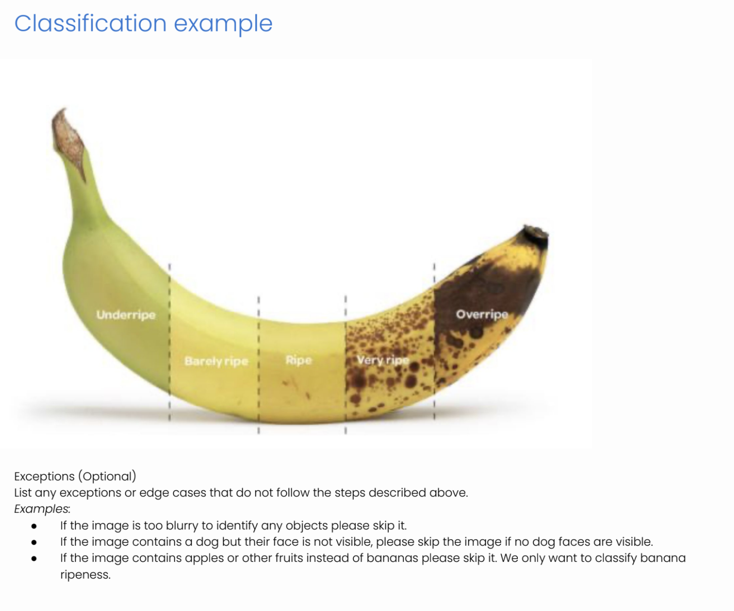 For example, if the project contains several entities/objects to be labeled with multiple classifications to choose from, explain each entity/object and each classification in sufficient detail: